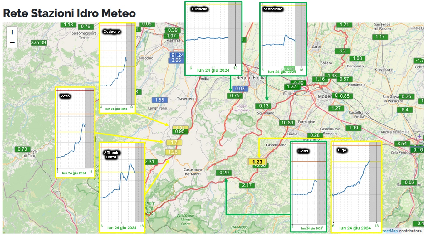 Attualmente superano soglia 1 il torrente Enza tra Cedogno e Vetto (al momento non desta preoccupazione, vedremo con le piogge attuali) e il Secchia all'altezza di Lugo (anche questo non mette ansia, ma facilmente crescerà ancora).