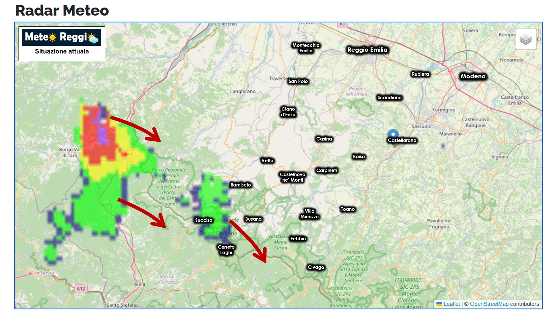 Un temporale è attivo nell'alta valle del Taro nel parmense, questo sembra crescere e spostarsi nuovamente verso l'alta valle dell'Enza. Vedremo se queste piogge si sostituiranno a quelle in fase di estinzione proprio poco coltre Succiso.