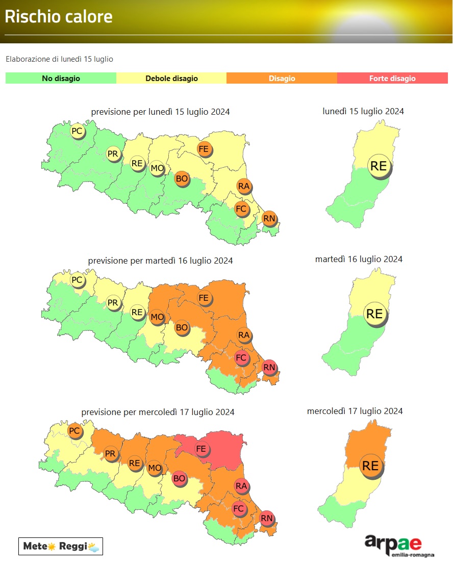 Le prime due giornate della nuova settimana vedranno un debole disagio tra il Po e la via Emilia, ma che già da mercoledì crescerà di colpo con un disagio ben percettibile da tutti. Caldo anche sulle zone di Collina dove i termometri varcheranno i 30°/31°C già da oggi, ma in quelle zone per parlare di disagio debole dovremo attendere mercoledì.