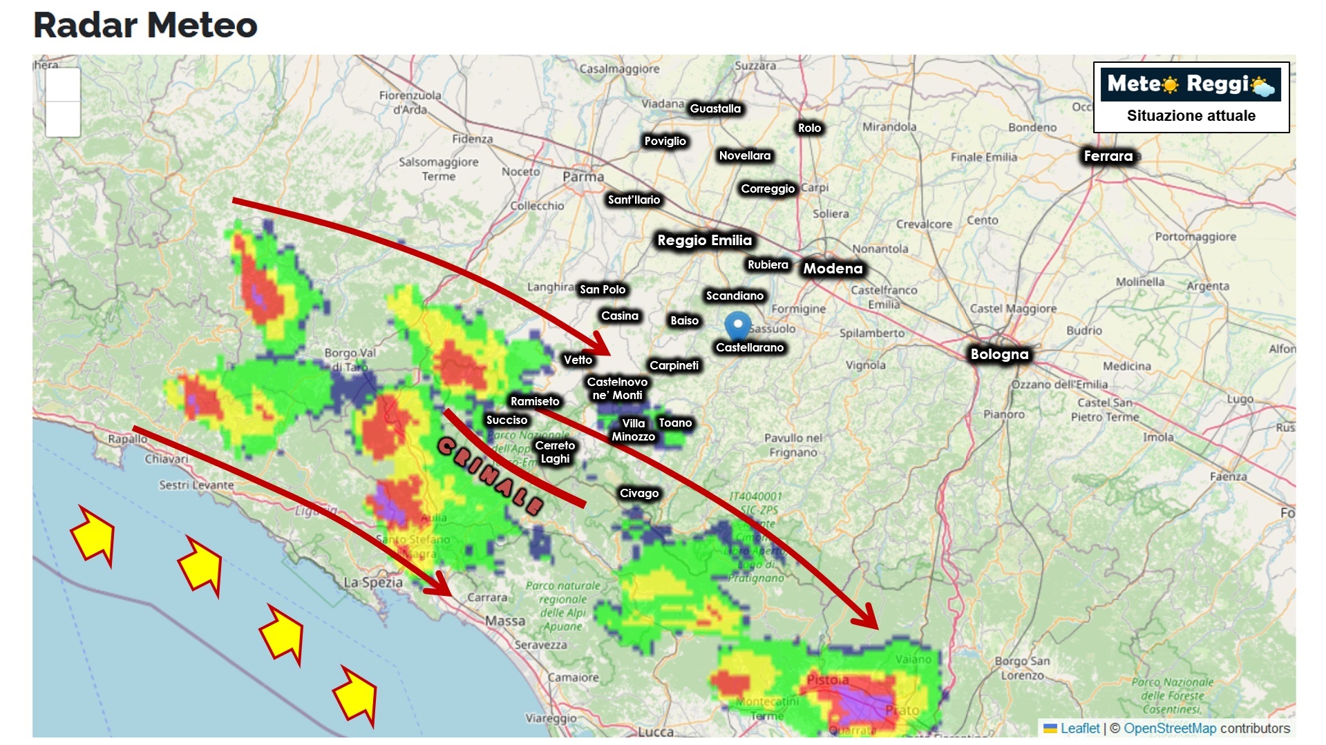 Nel pomeriggio, come da programma, ha preso forma un po' di vivace instabilità sul nostro Appennino. Un nastro trasportatore di temporali e acquazzoni che dal parmense arrivano nel reggiano e proseguono verso il modenese. Il grosso è soprattutto esposto nel versante sud tra Lunigiana e Garfagnana, ma l'impulso a valicare il Crinale porta qualche pioggia a spingersi anche più a nord fino a Castelnovo ne' Monti.