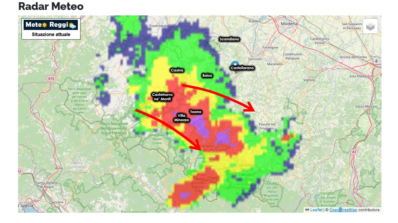 Forti rovesci stanno interessando attualmente le valli di Dolo e Secchia in spostamento verso il modenese. Localmente si è mostrata anche la grandine nei comuni di Ventasso, Villa Minozzo e Toano.