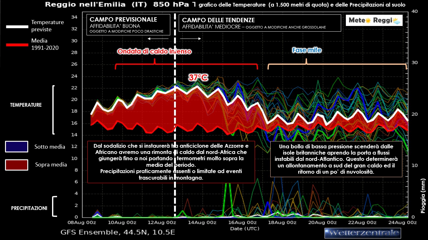 Questa onda ci accompagnerà fino a Ferragosto per sgonfiarsi nei giorni successivi quando i flussi atlantici faranno il loro ritorno nel nord-Italia, ma per sapere come si tradurranno nella pratica è ancora molto presto. Siamo nel campo delle ipotesi, della fanta-meteorologia poiché una previsione dopo i 3 giorni diventa sempre meno affidabile e si viaggia nel campo delle "tendenze". Magari anche l'ondata di caldo sarà meno feroce di quanto si prevede ora, ma per ora i modelli ci prospettano di nuovo 37°C.