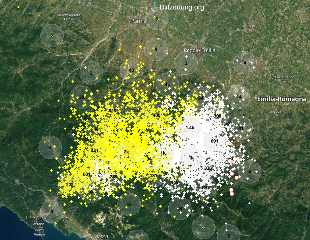 Ora il blocco di temporali con il suo carico di fulmini (oltre 10.000!!!) si sposta verso la riva destra del fiume Secchia in direzione modenese/parmense.