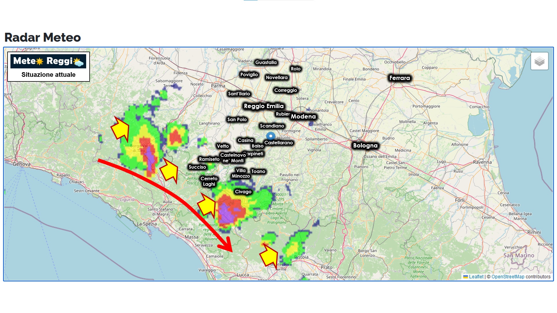 Ora abbiamo due vaste celle attive, una ad est che si forma dalle creste delle Alpi Apuane causando piogge nell'alta valle del Dolo e una seconda nella valle del Taro nel parmense. Questa seconda cella sembra quella più minacciosa per il reggiano perchè nelle prossime ore arriverà in prossimità dell'Enza.
