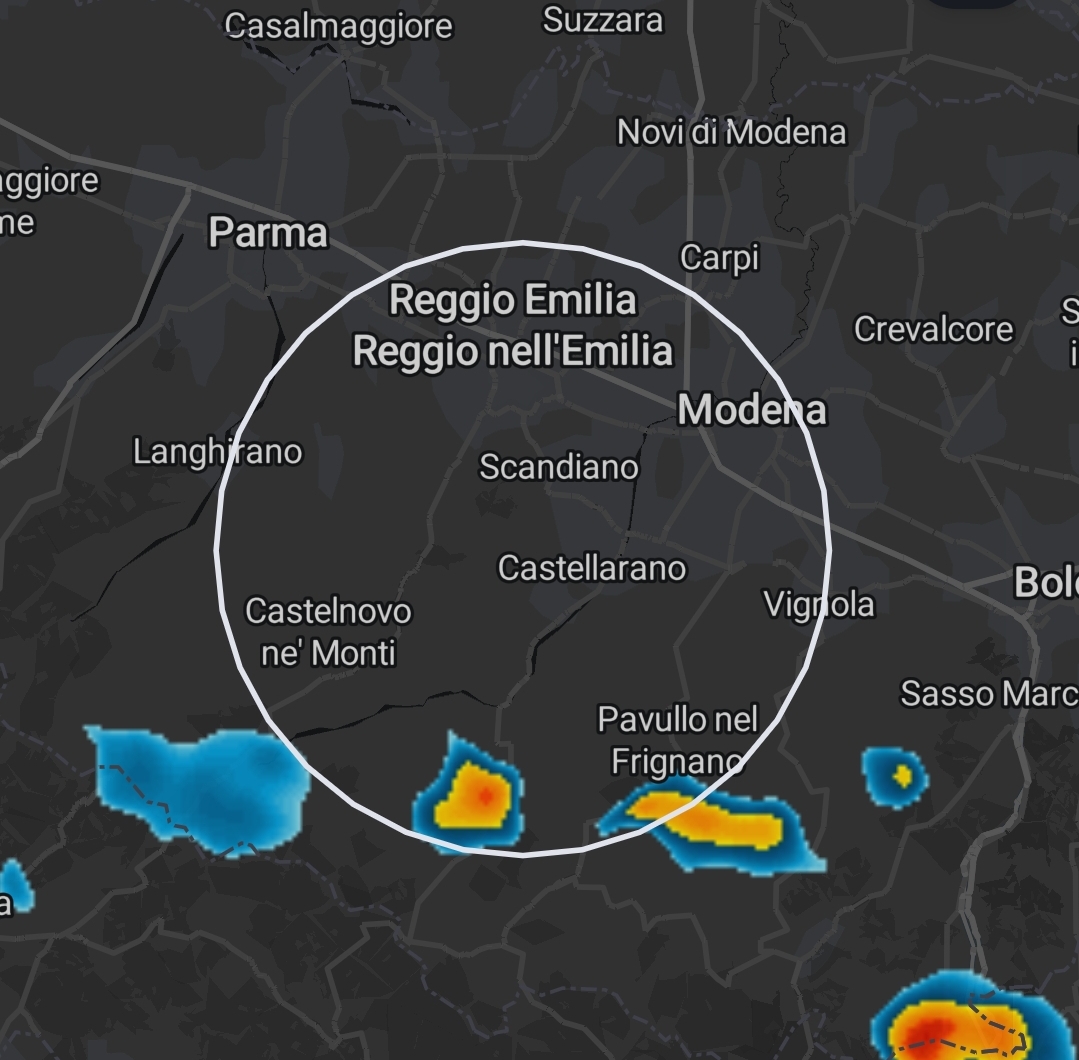 Nel reggiano abbiamo delle piogge nella valle del Dolo vicino a Toano. Vedremo gli sviluppi nei prossimi minuti, se la forza sarà sufficiente per raggiungere almeno la valle del Tresinaro.