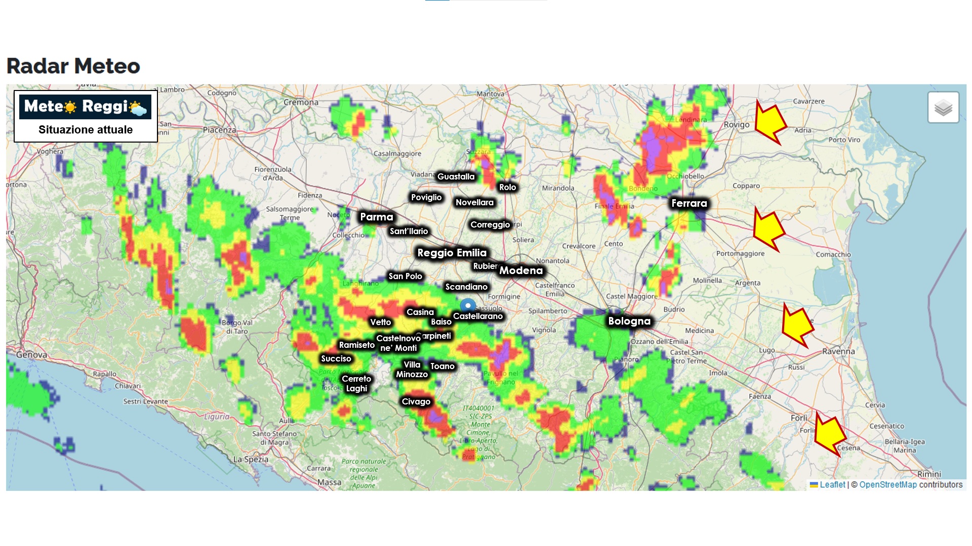 Per il resto dall'Appennino giungono notizie di una linea che si è un po' frammentata, con prevalenza di piogge tranquille e qualche acquazzone isolato ma nessuna grandine degna di nota fino ad ora ma attenzione all'arrivo sulla Pedecollinare. Forti acquazzoni interessano la zona collinare tra Casina, Ciano d'Enza e Canossa. Altri sono presenti tra Baiso e Levizzano, ma il grosso (sul lato est) è più spostato nel modenese.