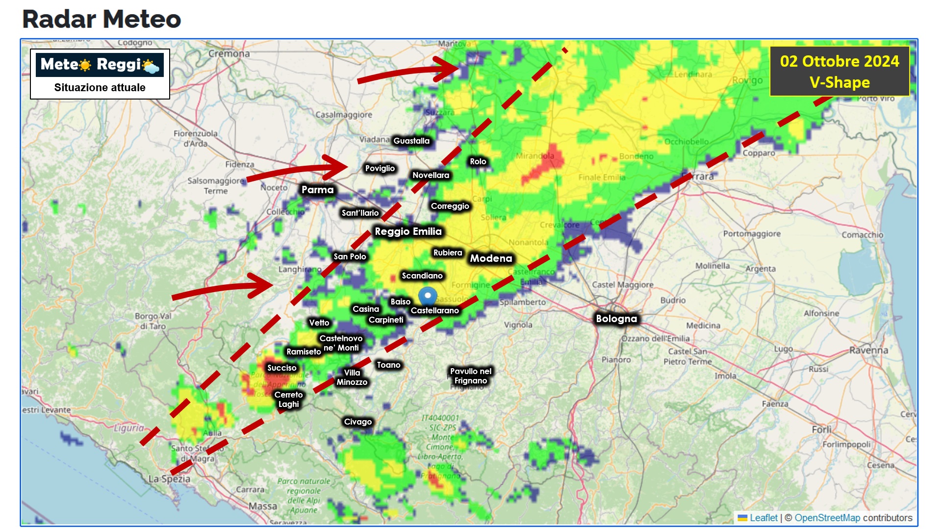 Da metà mattinata fino a pochi minuti fa siamo stati interessati dal progressivo passaggio di una linea piovosa che dalla Liguria si estende fino al Veneto. Più precisamente da un "V-Shape" di cui vi abbiamo parlato più volte anche in un recente passato e che aveva portato il torrente Enza a superare soglia 2 a metà della scorsa settimana.