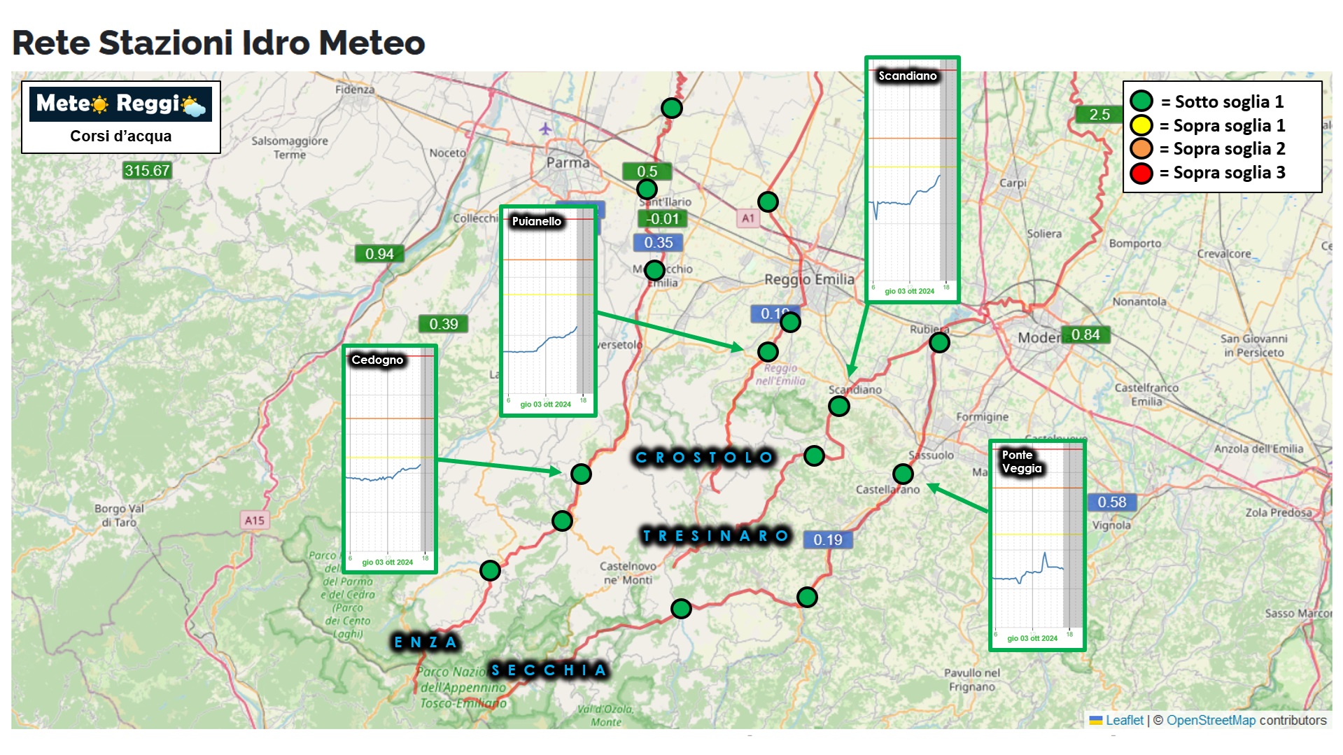 Il fatto che le piogge cadano costanti sta facendo sì che i nostri corsi d'acqua non diano segni di escandescenza, ma che piuttosto prediligano una crescita lenta e graduale. Attualmente tutti i nostri fiumi e torrenti non sono saliti sopra soglia 1 anche se facilmente questo valore potrebbe essere varcato in un'oretta o due dal torrente Tresinaro e dall'Enza a Cedogno. Questo perchè gli accumuli maggiori, come detto, non li abbiamo in alta quota ma sulla Pedecollinare e nella valle del Tresinaro abbiamo molta argilla pronta a far scivolare velocemente l'acqua meteorica nel torrente.