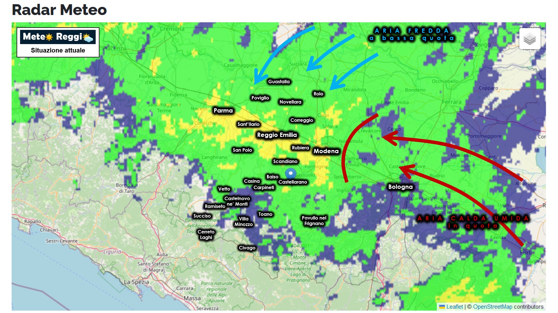 Il tutto è dovuto allo scontro in Pianura tra aria calda di Scirocco ed aria fredda di Bora che si nota proprio dalle immagini restituite dal radar meteo di ARPAE. L'aria fredda in basso interatisce con quella mite e calda più in quota creando l'instabilità che dà come frutto questa pioggia così a nord.