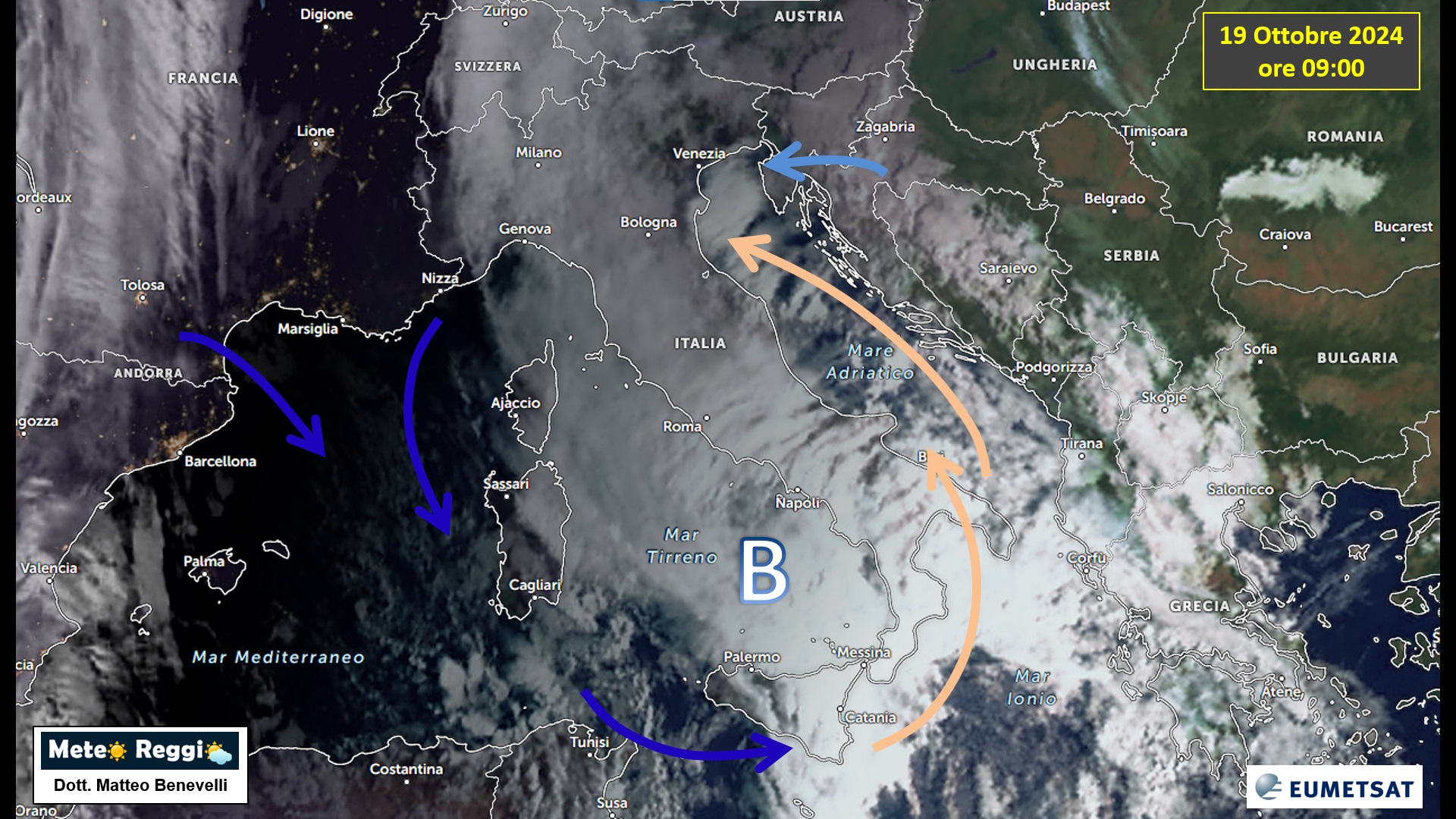 Temperature attorno ai 15°C, ma con l'arrivo del vento mite di Scirocco i valori saliranno attorno ai 18°C. Dall'immagine satellitare si nota benissimo il "motore" di questa perturbazione che è rappresentato da un vortice di bassa pressione nel basso Tirreno che dalla Sicilia convoglia correnti di Scirocco in risalita dal mare Adriatico verso di noi. Mare Adriatico che, neanche a dirlo, è più caldo del normale in questa stagione e che alimenta il vento di umidità pronta a condensare. Una seconda corrente, poi, meno intensa ma in grado di modificare la traiettoria del vento di Scirocco fa il suo ingresso dalla Croazia/Slovenia insinuandosi sotto il primo innescando le correnti di risalita che portano alla formazione della pioggia.