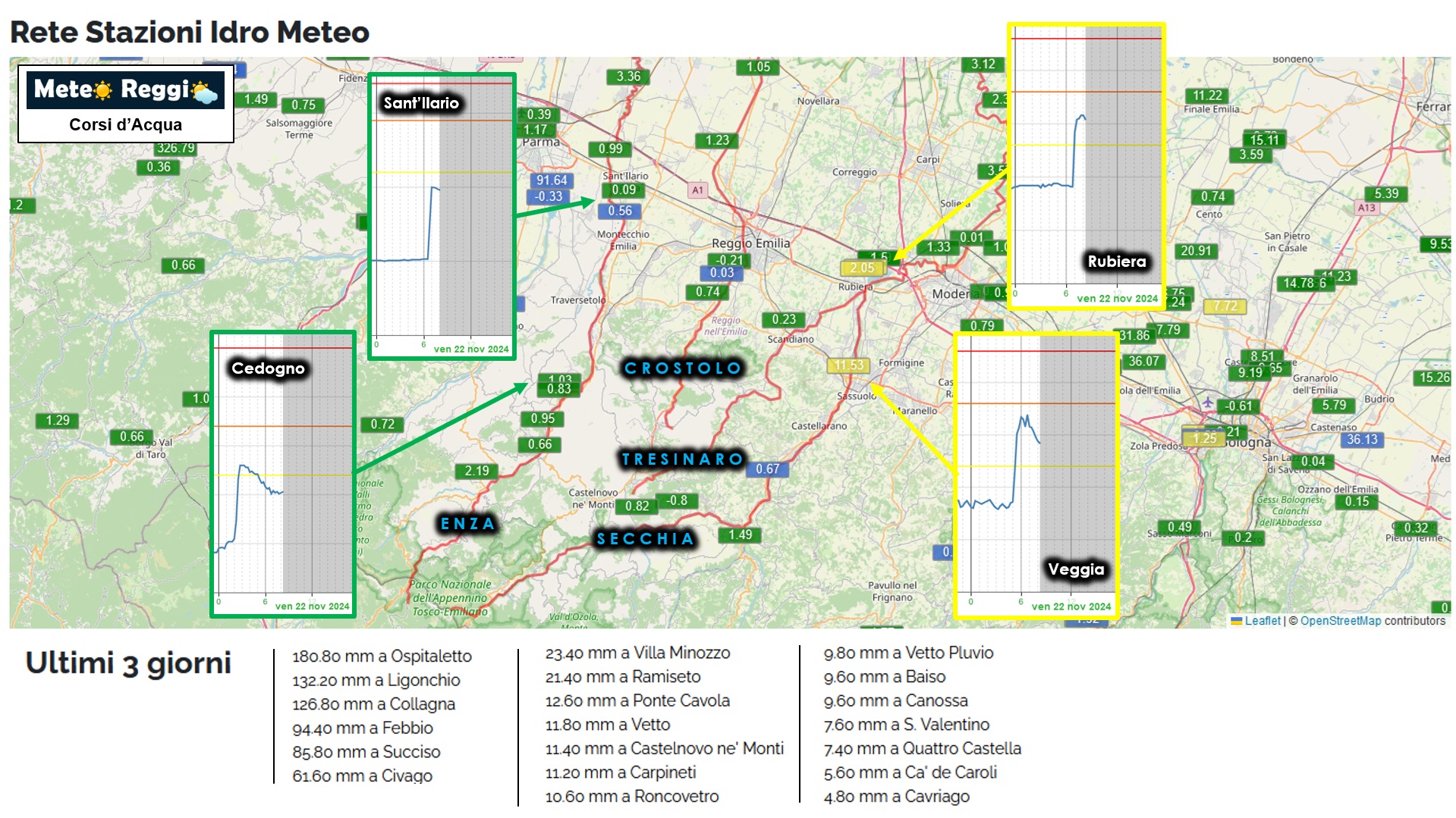 Nella notte e prime ore del mattino ha superato soglia 1 nella tratta collinare, ora è sceso sotto tale livello su tutte le stazioni. L'onda di piena, modesta, si trova vicina a Sant'Ilario d'Enza.