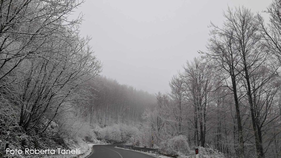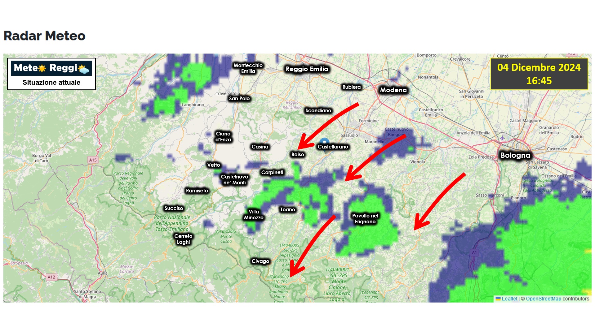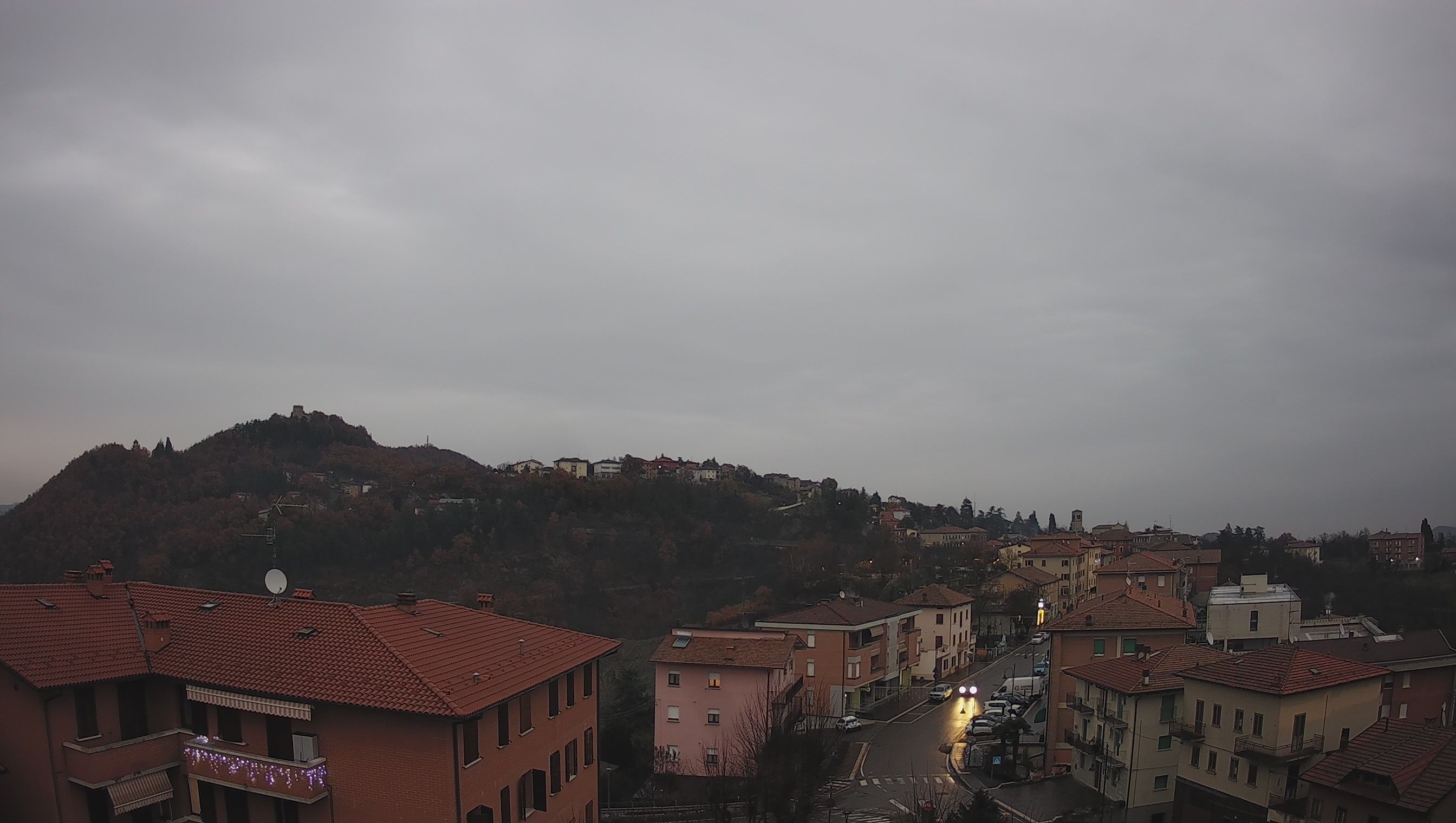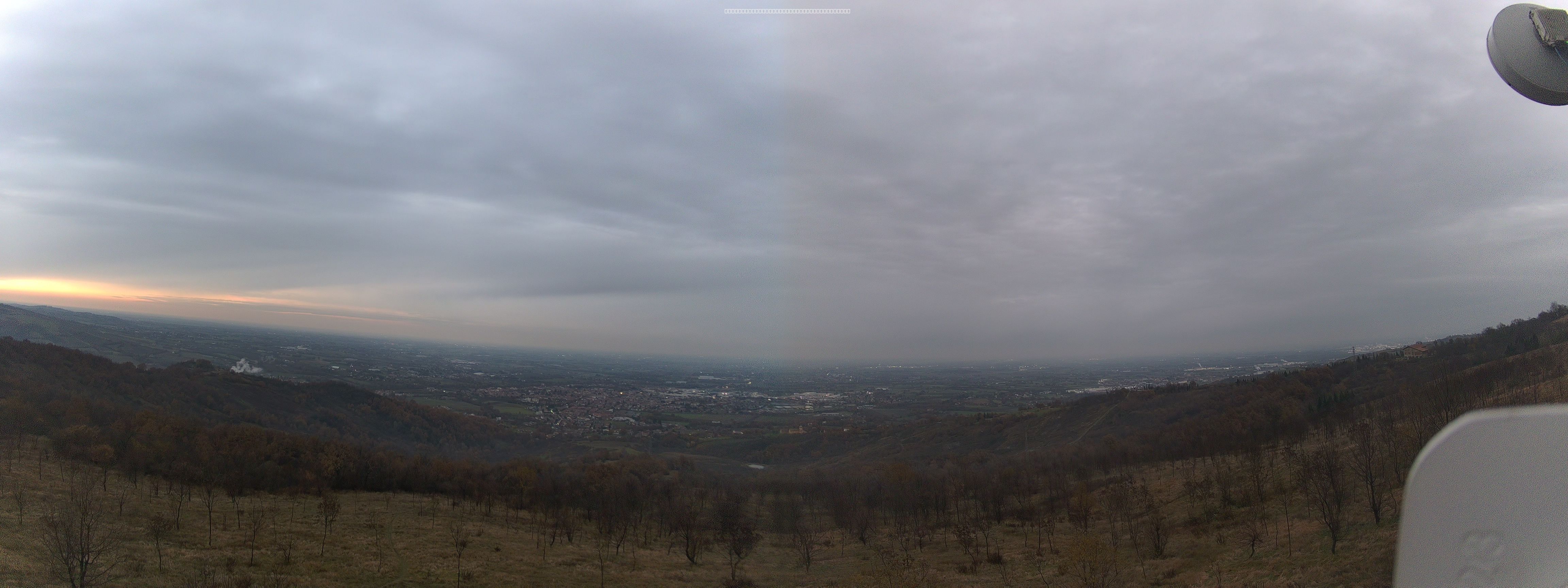 Ancora cielo coperto su tutto il reggiano, anche se uno spiraglio avanza da nord-ovest. Cielo azzurro sulla Lombardia che sta per raggiungere le rive del Po reggiano tra Brescello e Boretto. Abbiamo ancora delle deboli precipitazioni sparse in Appennino con sporadici fiocchi di neve al Cerreto. Qui abbiamo anche una tenue velatura bianca dovuta ai fiocchi caduti nell'arco della perturbazione.