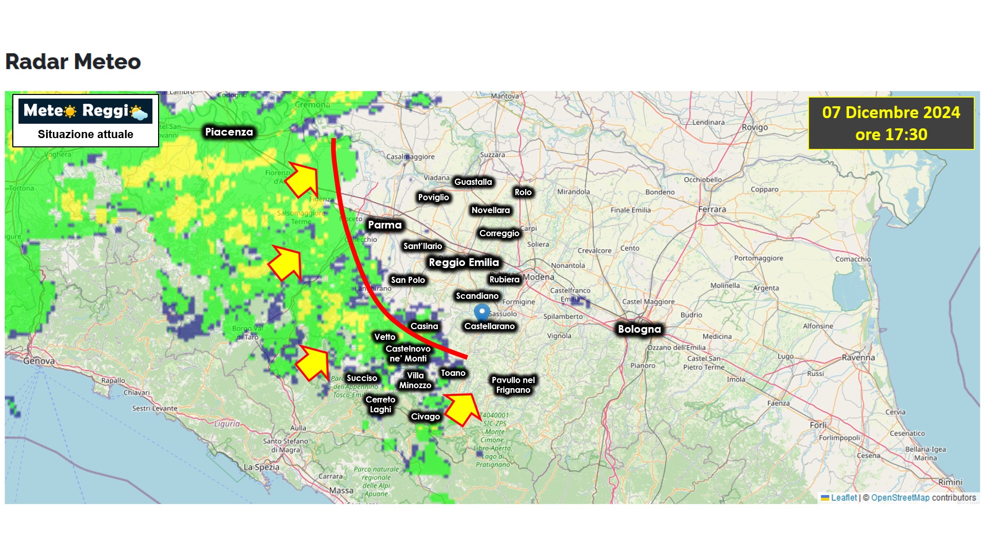 Avanza di gran carriera il fronte piovoso che si è formato nell'ultima ora nell'alto Appennino parmense/piacentino. Un fronte debole, ma che ha raggiunto in questi ultimi minuti anche il nostro territorio estendendosi a tutta la Collina dall'Enza verso la valle del Tresinaro che verrà raggiunta a breve.
