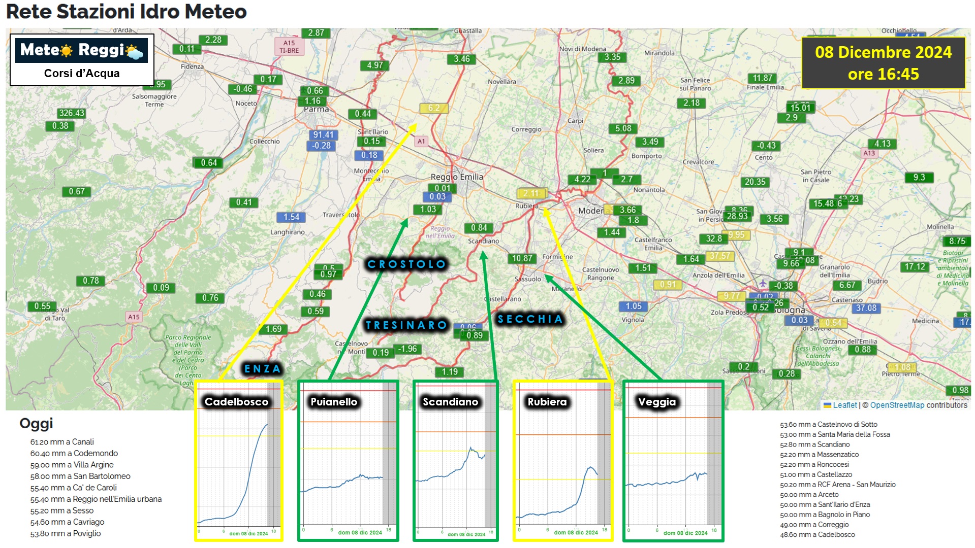 Nessun segno di nervosismo, tutto sotto soglia 1 a parte la stazione di Rubiera che risente del passaggio della piena del Tresinaro. Non ci aspettiamo criticità.