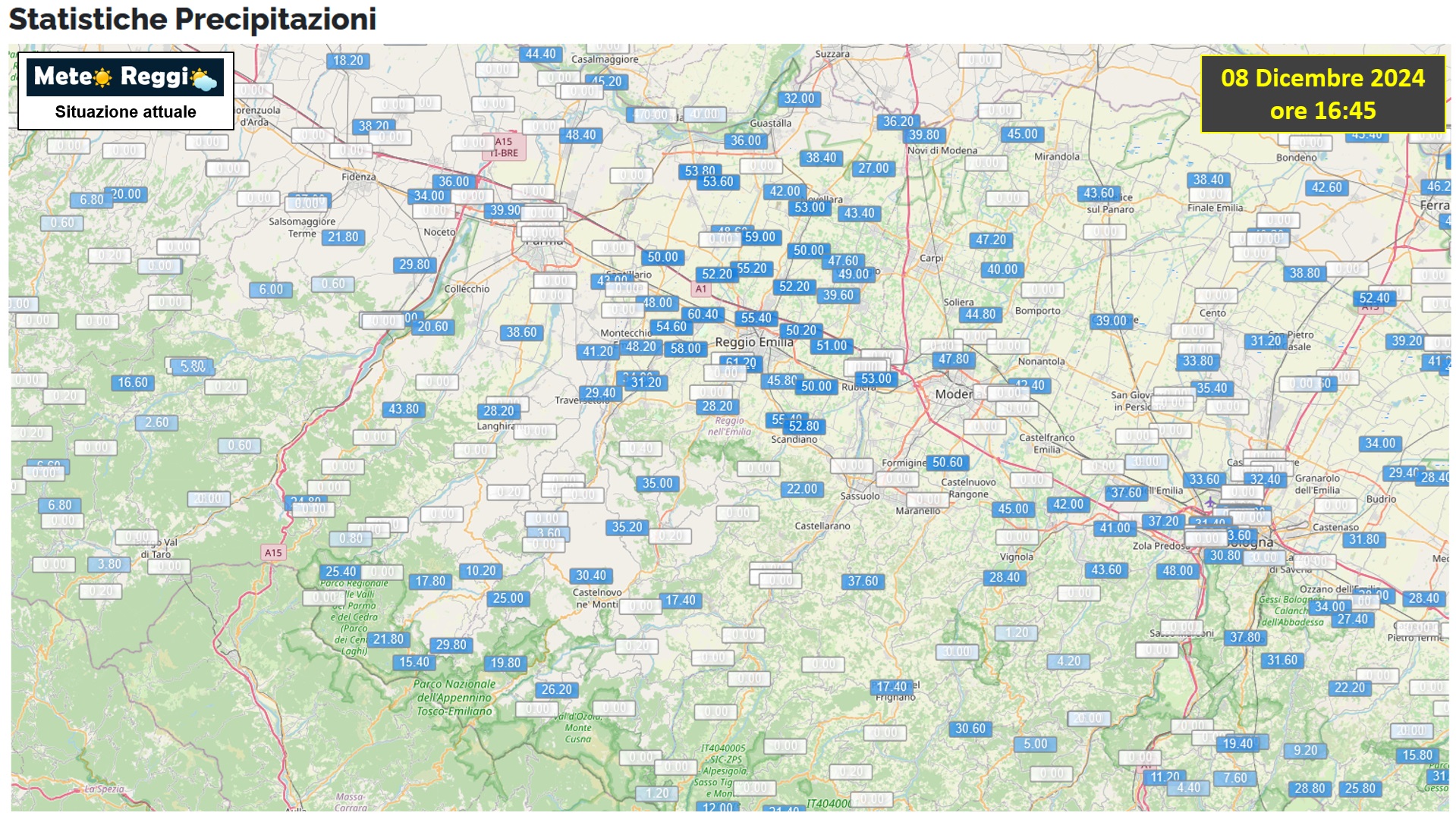 I millimetri caduti ormai superano le soglie dei 50/60 in diverse stazioni. La fascia Pedecollinare è la più colpita con accumuli importanti nei bacini di Tresinaro e Crostolo, i due corsi d'acqua che stanno dando più segno di nervosismo in queste ore.