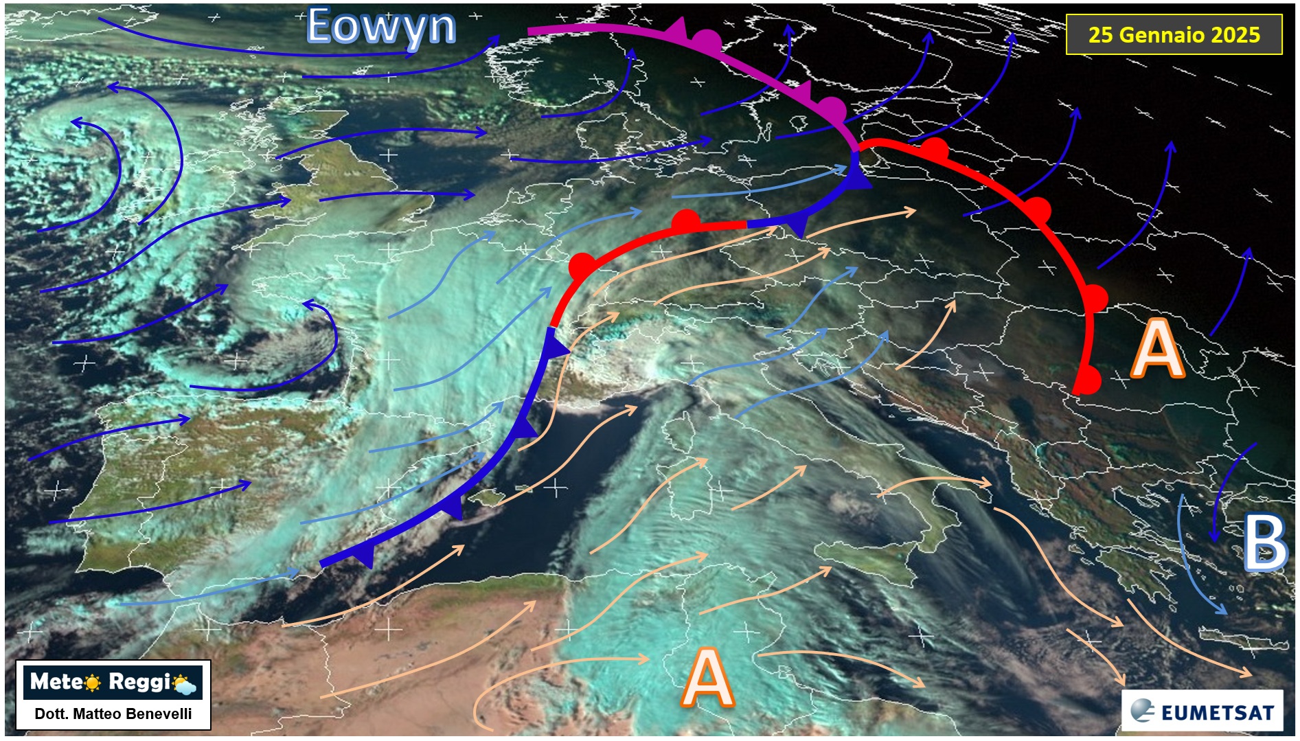 Cala la sera su un'altra giornata che ci vede alle prese con i postumi del passaggio del ciclone "Eowyn" nel nord Europa. Correnti calde e umide dal Mediterraneo risalgono verso il nostro Appennino scavalcandolo. Questo genera una ventilazione secca e mite che alimenta l'inversione termica e nel mezzo favorisce la formazione di nebbie che coprono la Pianura e la bassa Collina nei fondovalle.