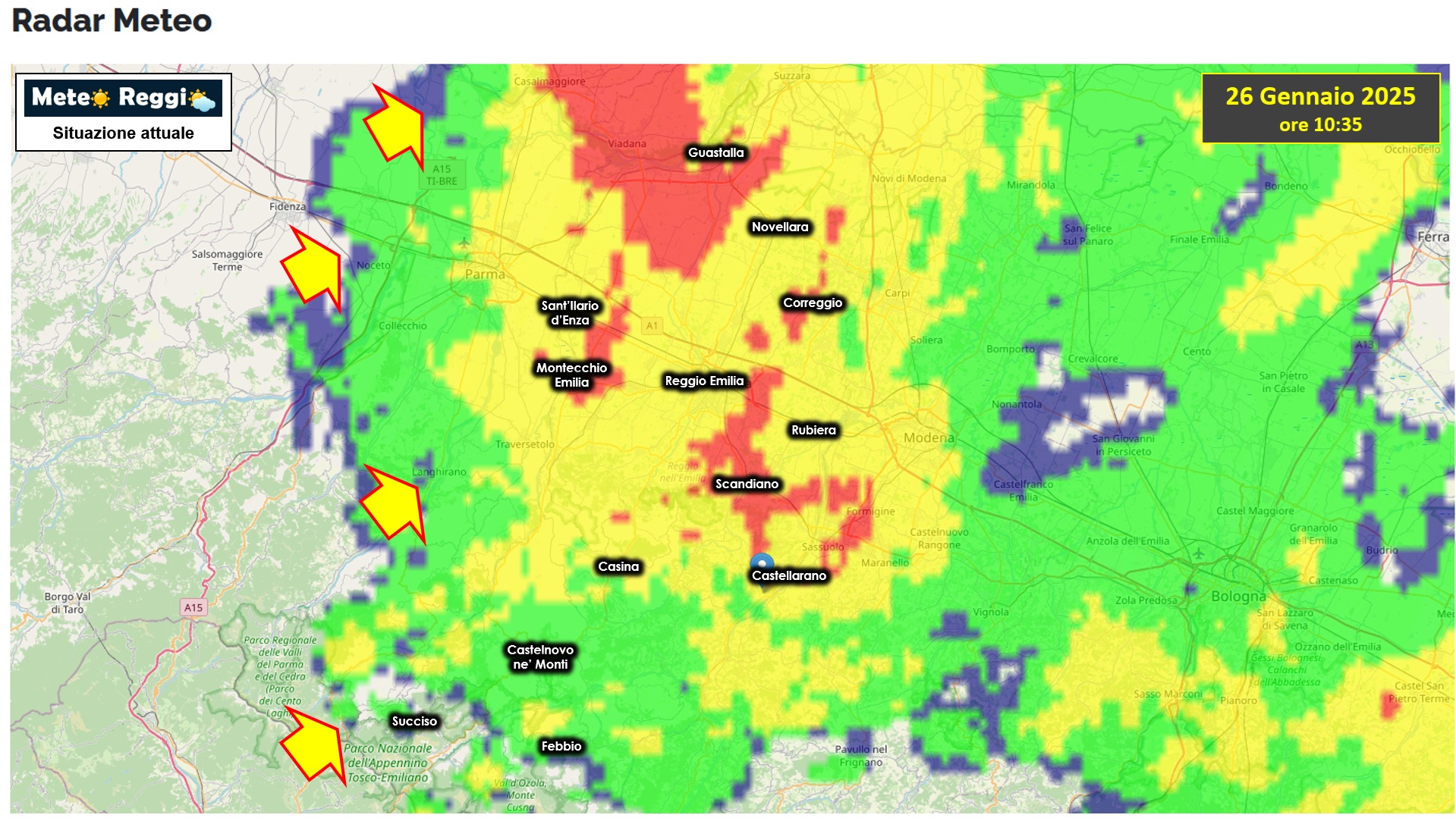 La perturbazione arriva dal sud-ovest e penetra soprattutto dall'Appennino parmense/piacentino, più permeabile del nostro. Le piogge più intense, infatti, stanno interessando la parte nord-occidentale, ma un po' tutta la Pianura fino alla Pedecolliare in questi minuti è interessata da acquazzoni.