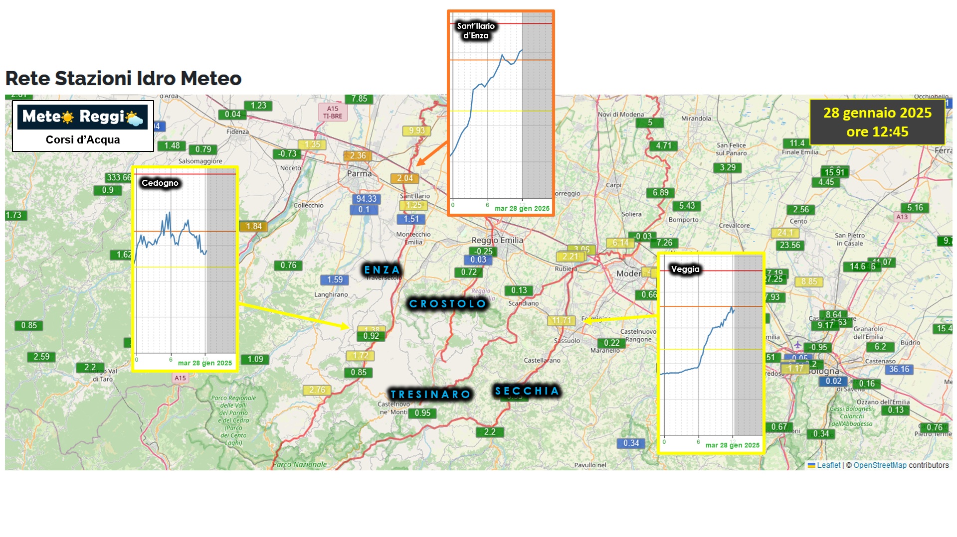 Bollettino fiumi L'Enza supera soglia 2 a Sant'Ilario, ma l'onda di piena sembra stia passando proprio in questi minuti. Non si arriverà a toccare soglia 3 e questo fa ben sperare che non si arrivi alla chiusura del ponte di Sorbolo che è aperto al traffico. Supera soglia 1 il Secchia, ma senza particolari tirmori. E' stata sfiorata poco fa soglia 2 nei pressi di Veggia, ma non è stata superata. Nessuna preoccupazione da questo fronte. Nessuna preoccupazione nemmeno da parte dei torrenti che scendono dalla Collina che sono del tutto tranquilli.