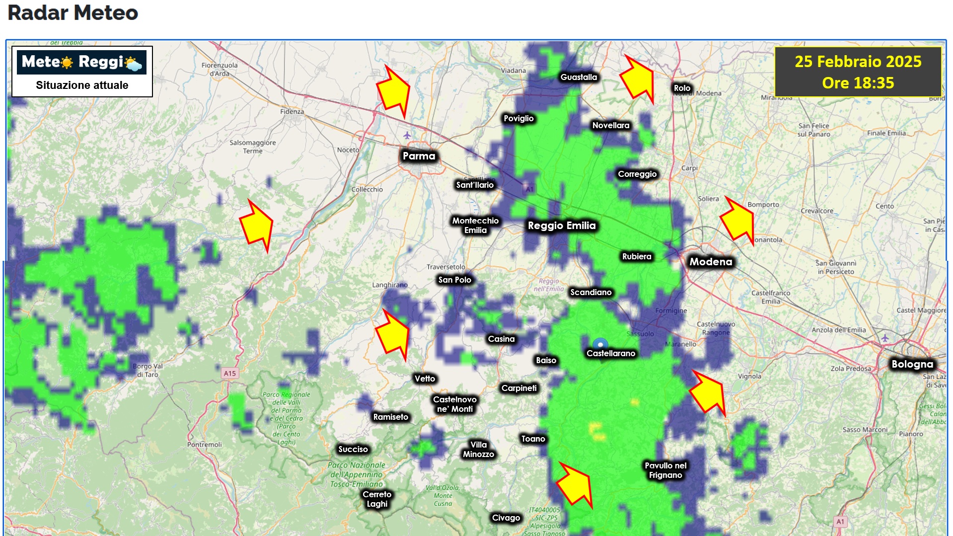 Scende la sera su una giornata poco entusiasmante, che ha visto qualche debole pioviggine intermittente, come la linea piovosa che attualmente ci sta attraversando da sud-ovest verso nord-est. Un nucleo piuttosto debole che non presenta ostilità o sostanziosità in nessun punto della sua lunga estensione. Attualmente sta per lasciare Reggio Emilia per spingersi verso la Bassa nord-orientale.