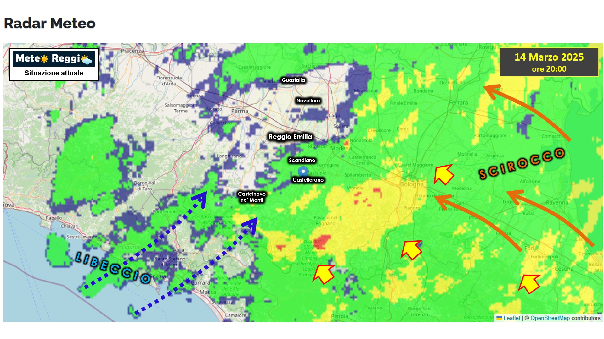 Riprendono vigore le piogge. Questa volta il flusso dominante è la corrente di Scirocco da est che si scontra ancora con il Libeccio che soffia in alta quota. Questo innesca forti piogge che stanno facendo il loro arrivo sul reggiano da modenese/bolognese.