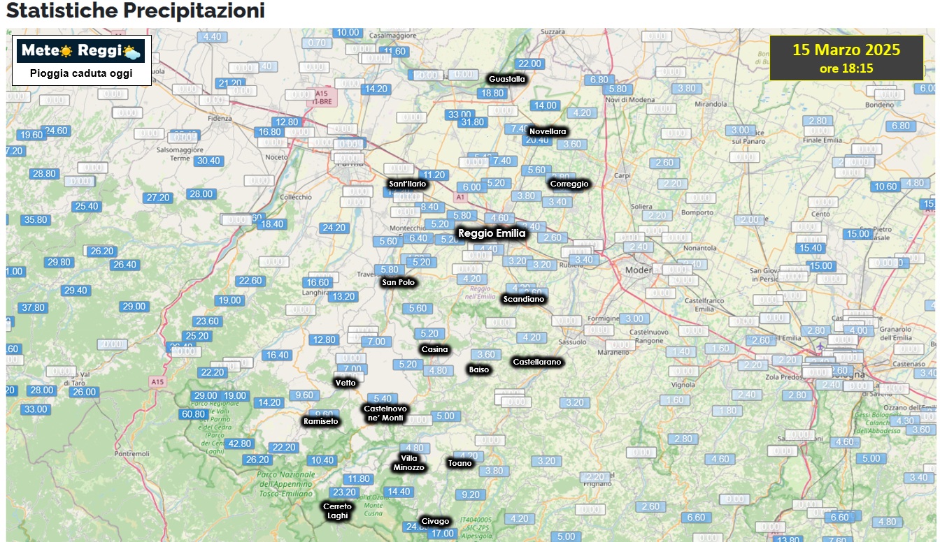 33.20 mm a Poviglio 31.80 mm a Castelnovo di Sotto 27.80 mm a Reggiolo 27.60 mm a Guastalla 25.20 mm a Santa Maria della Fossa 24.80 mm a Civago 23.40 mm a Ospitaletto 22.60 mm a Succiso 18.80 mm a Gualtieri 18.60 mm a Novellara 15.20 mm a Boretto 14.40 mm a Febbio 11.80 mm a Ligonchio 11.60 mm a Sant'Ilario d'Enza 10.40 mm a Collagna 10.00 mm a Santa Vittoria 9.60 mm a Ramiseto 9.20 mm a Montecchio Emilia 8.40 mm a Villa Argine 7.20 mm a Vetto Pluvio 7.20 mm a Vetto 7.20 mm a Roncovetro 6.80 mm a Bibbiano 6.20 mm a Codemondo 6.20 mm a Roncocesi 6.00 mm a Canossa 6.00 mm a Sesso 5.80 mm a Bagnolo in Piano 5.80 mm a Rolo 5.60 mm a Cadelbosco 5.60 mm a San Bartolomeo 5.40 mm a La Stella 5.40 mm a Castelnovo ne' Monti 5.40 mm a Predolo 5.20 mm a Quattro Castella 5.20 mm a Cavriago 5.20 mm a Villa Minozzo 5.00 mm a Quattro Castella 5.00 mm a Ponte Cavola 4.80 mm a Canali 4.80 mm a Carpineti 4.60 mm a Reggio nell'Emilia urbana 4.40 mm a S. Valentino 4.20 mm a Rio Saliceto 4.20 mm a Ca' de Caroli 4.20 mm a Fabbrico 4.20 mm a Broletto di Albinea 3.80 mm a Massenzatico 3.80 mm a San Martino in Rio 3.60 mm a Scandiano 3.60 mm a Prato di Correggio 3.60 mm a Baiso 3.40 mm a Arceto 3.40 mm a Correggio 3.40 mm a RCF Arena - San Maurizio 3.20 mm a Bosco di Scandiano 2.60 mm a Castellazzo