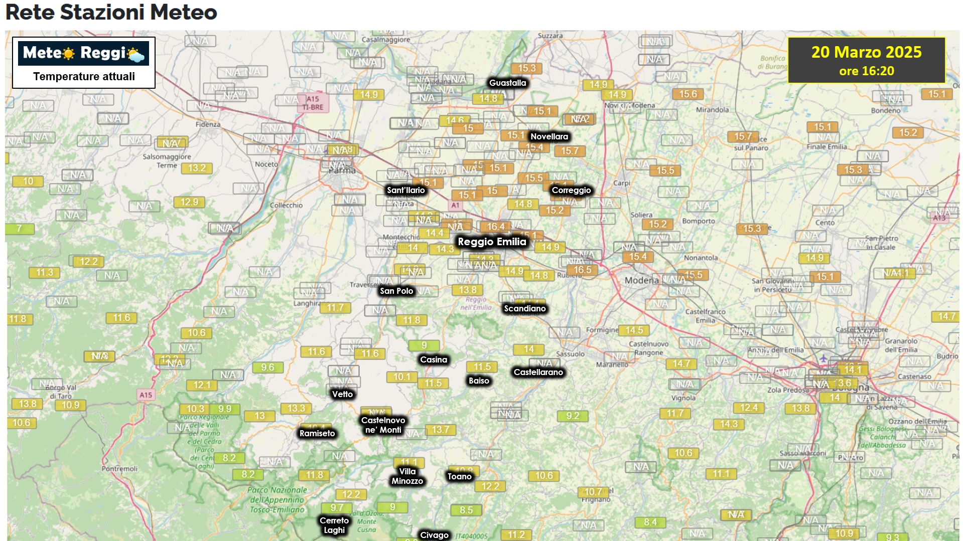 Il secondo chiaro segnale di un cambiamento, invece, ci arriva a livello del suolo con temperature massime che in Appennino sono tornate a superare la soglia dei 10°C per via delle correnti di Libeccio. Ecco le temperature massime toccate in provincia di Reggio Emilia oggi: