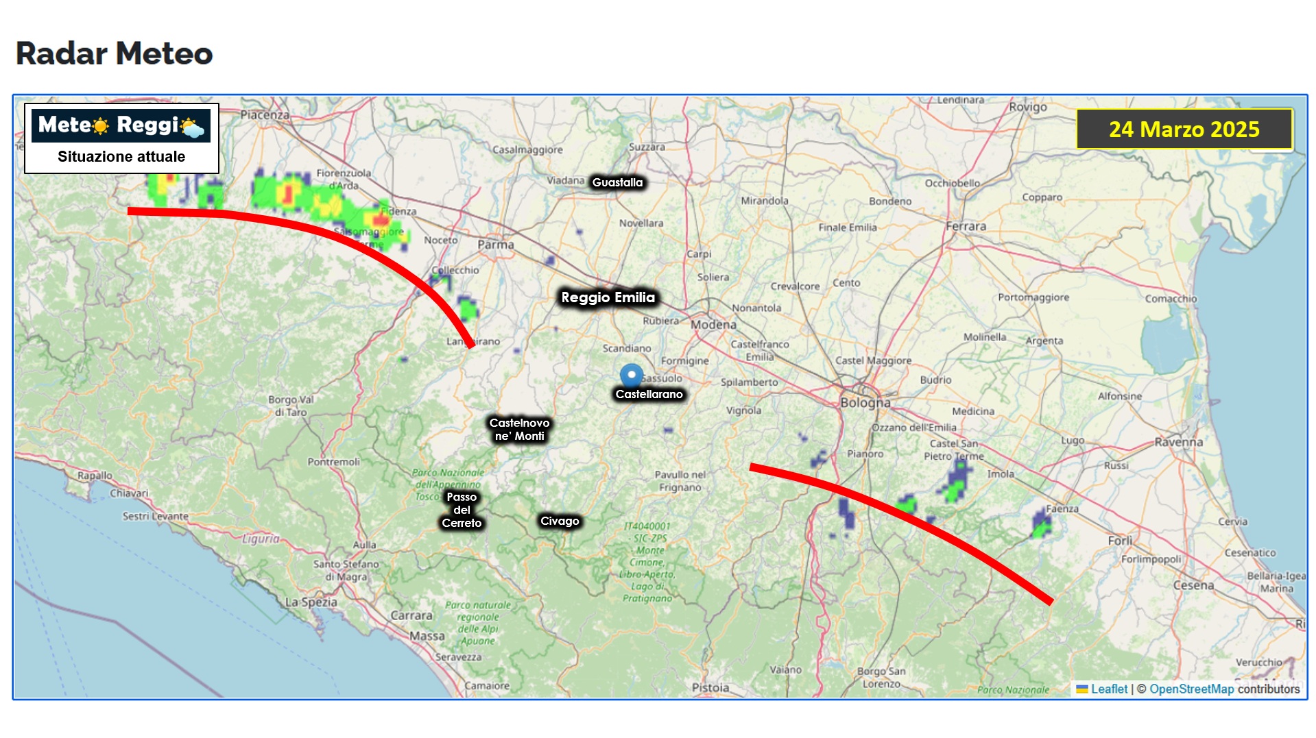 Ad ovest in direzione Parma/Piacenza abbiamo già i primi temporali che stanno prendendo forma in linea, mentre nel reggiano sembra reggere per il momento il muro rappresentato dal nostro Gigante.