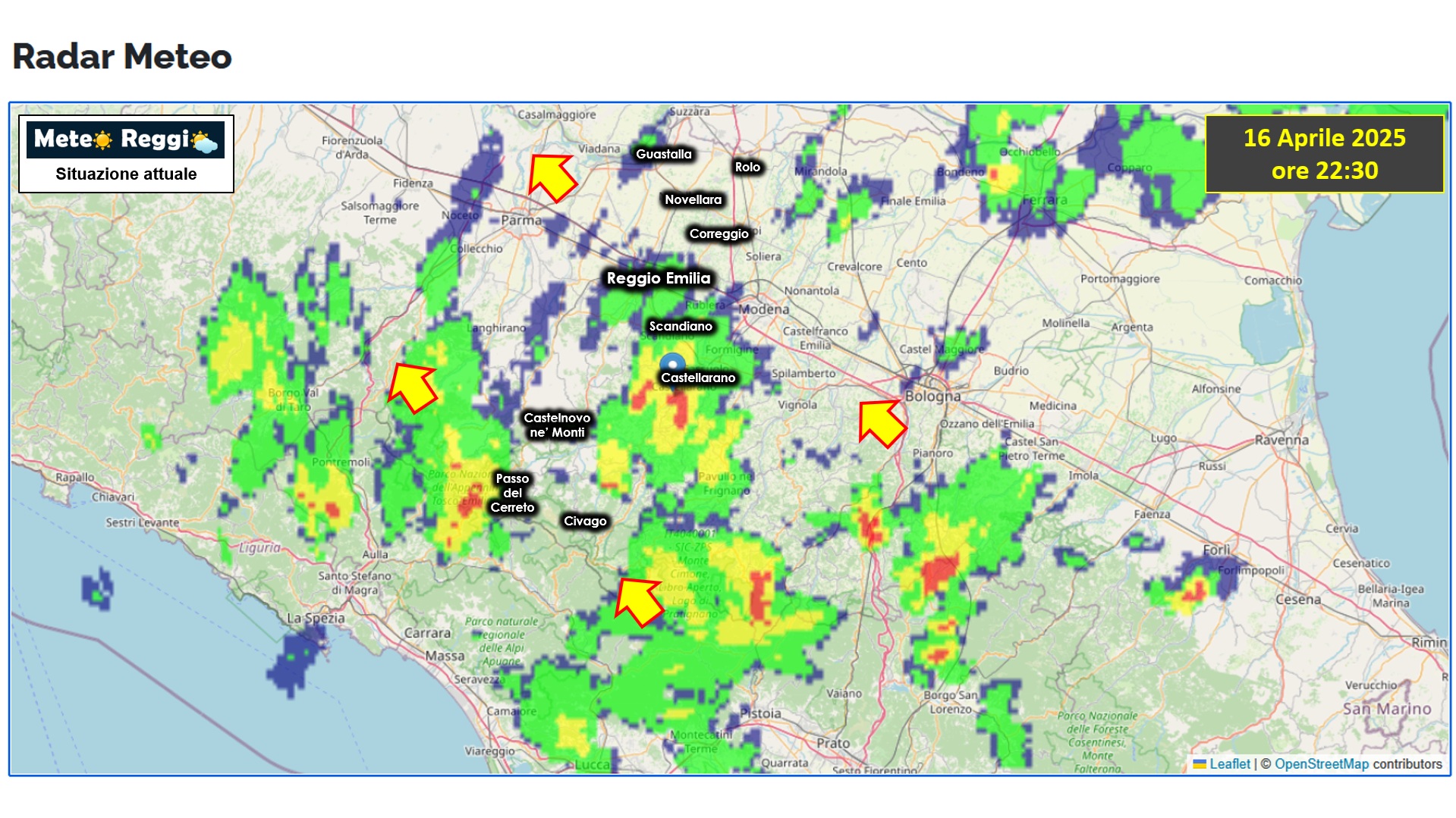 Riprendono vigore le piogge a sud della via Emilia. Forti acquazzoni arrivano dall'Appennino modenese verso il reggiano. Si tratta di fenomeni frammentati che corrono a gran velocità verso nord-ovest.