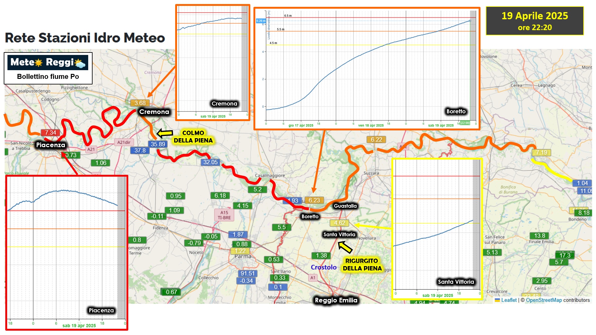 Si segnala anche un superamento di soglia 1 da parte del Crostolo all'altezza di Santa Vittoria. Questo è un evento fisiologico definito "rigurgito". Il rigurgito nel torrente Crostolo è un fenomeno idraulico che si verifica quando le acque del Po, salendo di livello, ostacolano o addirittura bloccano il deflusso delle acque del Crostolo nel fiume principale. In pratica, il Po “spinge indietro” l’acqua del Crostolo, facendo risalire il livello del torrente anche per diversi chilometri verso monte.