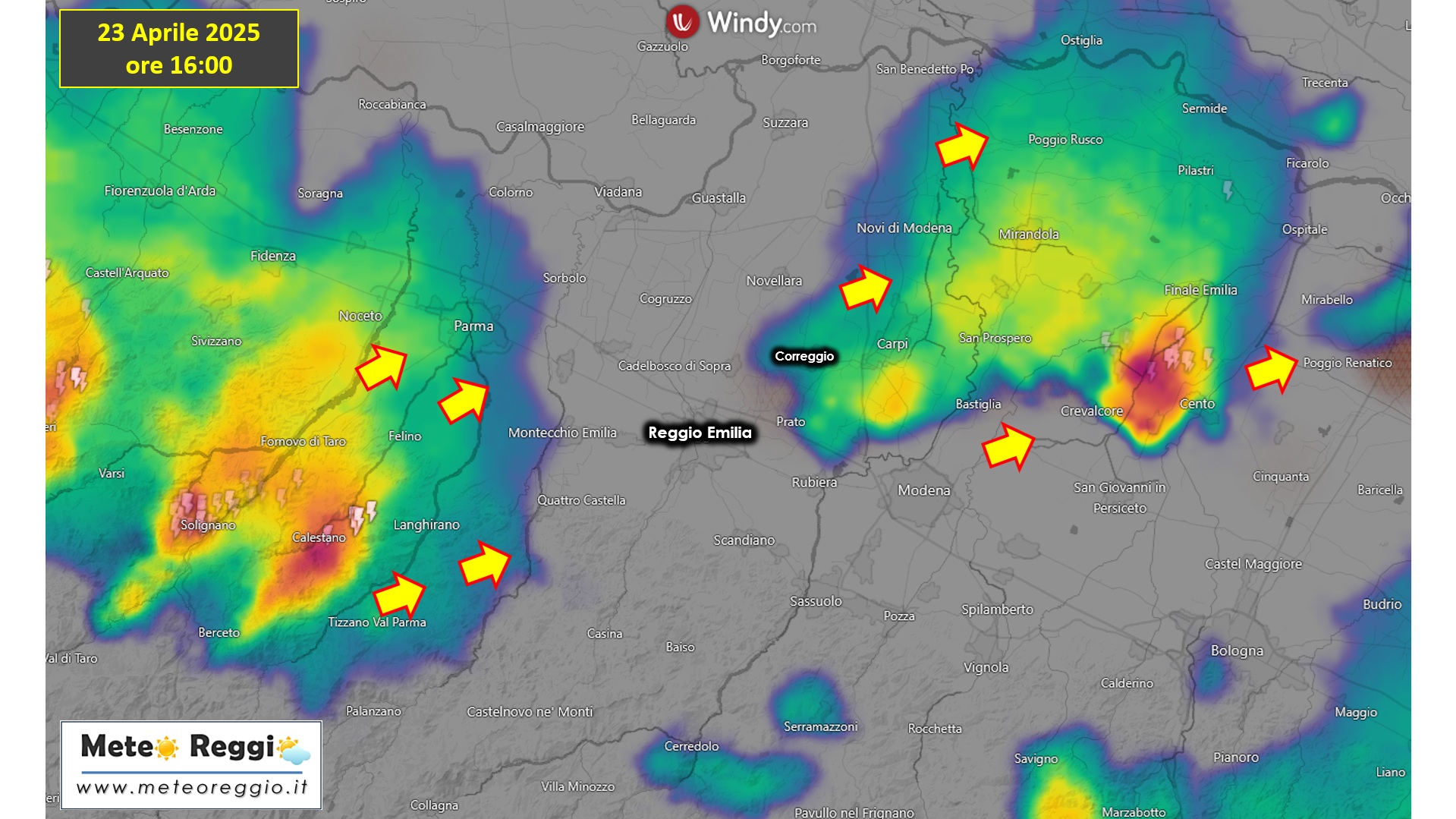 Una seconda cella si avvicina dall'Appennino parmense, il nucoleo si trova sopra Langhirano ma le prime gocce di pioggia si stanno spingendo contro la linea del torrente Enza a confine con il reggiano. Il sistema sta predendo un po' di forza, ma facilmente le piogge raggiungeranno anche la valle dell'Enza e la sua Pedecollinare nei prossimi minuti. Ombrelli pronti tra San Polo, Quattro Castella, Bibbiano e Montecchio Emilia.