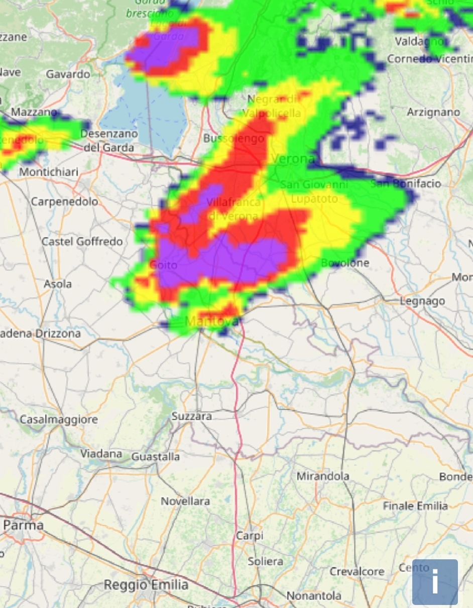 Come da programma il sistema temporalesco ha trovato nuova linfa arrivato sul lago di Garda e le correnti in uscita dalla valle dell'Adige lo ha deviato verso sud-est.