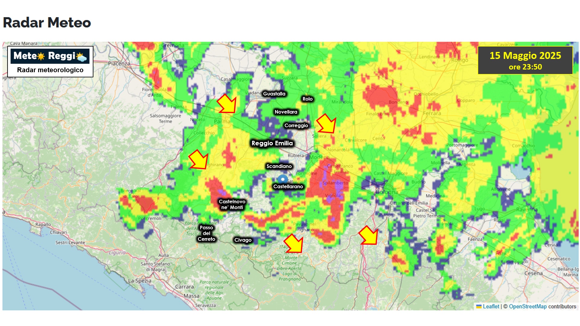 I nuclei che erano presenti tra Reggiolo/Rolo/Campagnolia e quello di Rubiera/Masone si sono fusi in un unico grosso temporale che si è abbattuto su Modena ed il suo comprensorio ceramico. Attualmente si sta spostando verso la Collina e l'alto Appennino modenese con eventi di grandine potenzialmente "fastidiosi".