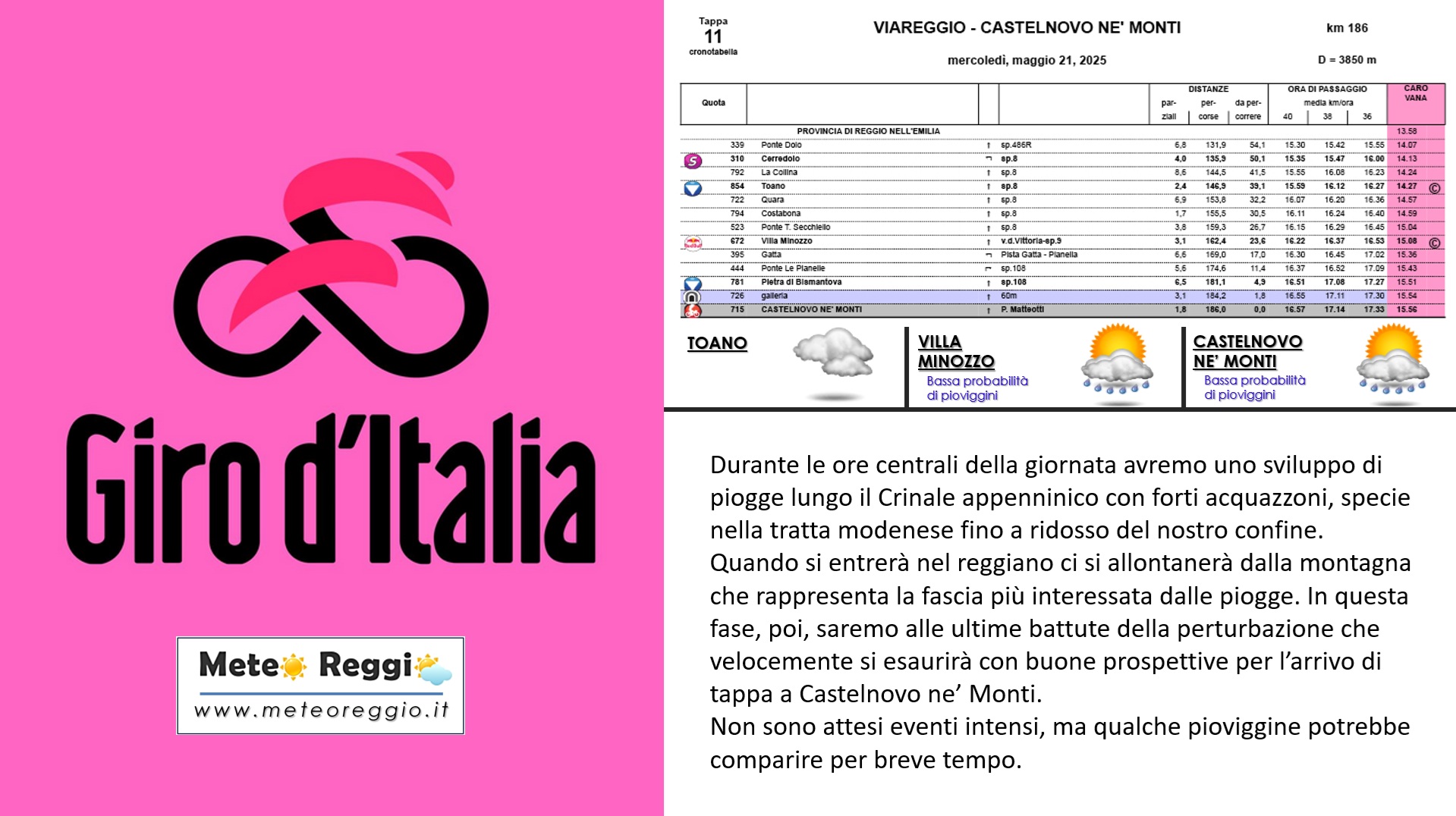 Nel primo pomeriggio avremo delle piogge in alta Montagna con probabile sconfinamento verso nord in direzione Castelnovo ne' Monti e Villa Minozzo. Si tratterà di un breve momento di un'oretta o due di ostilità, ma il tutto dovrebbe spegnersi già a metà pomeriggio ed estinguersi proprio nel momento del passaggio della tappa in territorio reggiano e dell'arrivo a Castelnovo ne' Monti.
