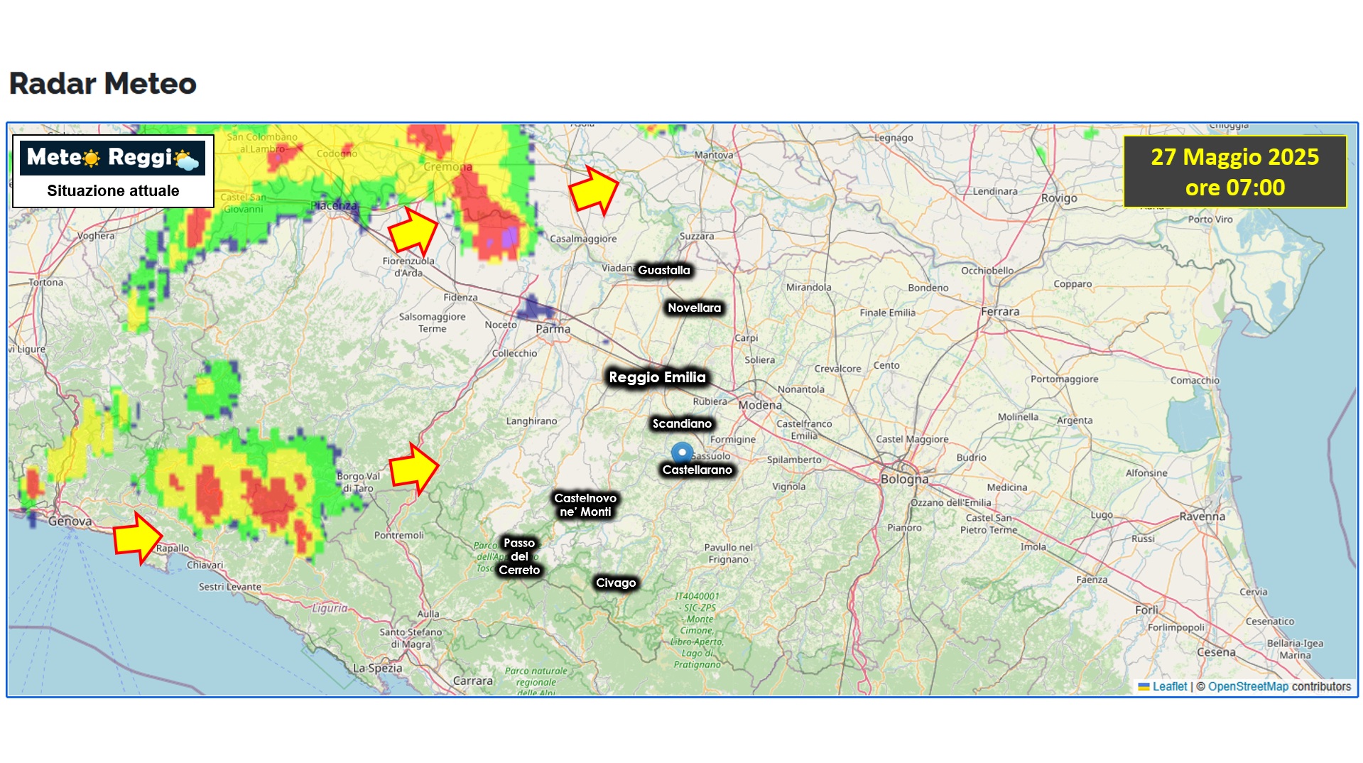 Sull'appennino parmense, infatti, si nota in arrivo da Genova una nuova cella piovosa che muove verso il reggiano. Non è remota l'ipotesi che entro un'ora la pioggia ci raggiunga ad iniziare dall'Appennino e successivamente la Pianura.