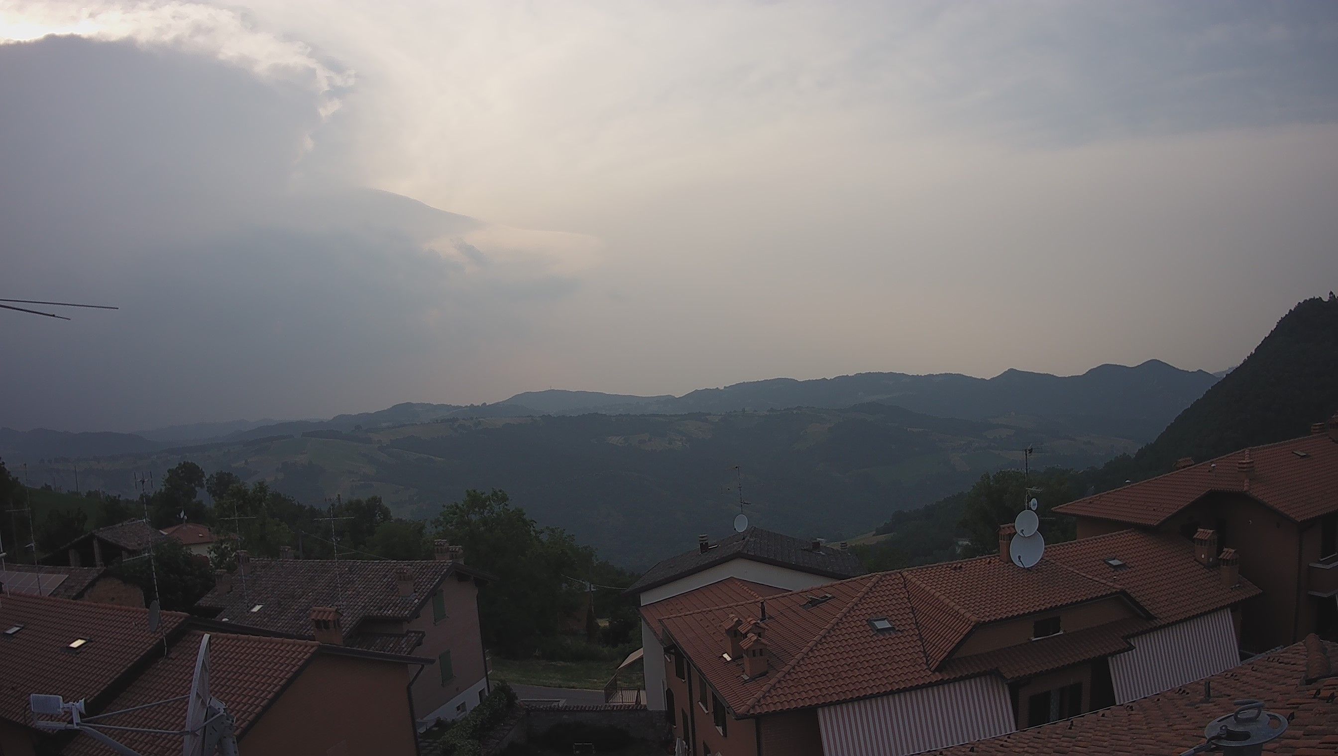 Le prime ombre hanno raggiunto la Val d'Enza e del Crostolo e la torre di nuvole, sfruttando il Sole sempre più basso, inizia a proiettare la sua ombra anche sulle colline del Tresinaro.