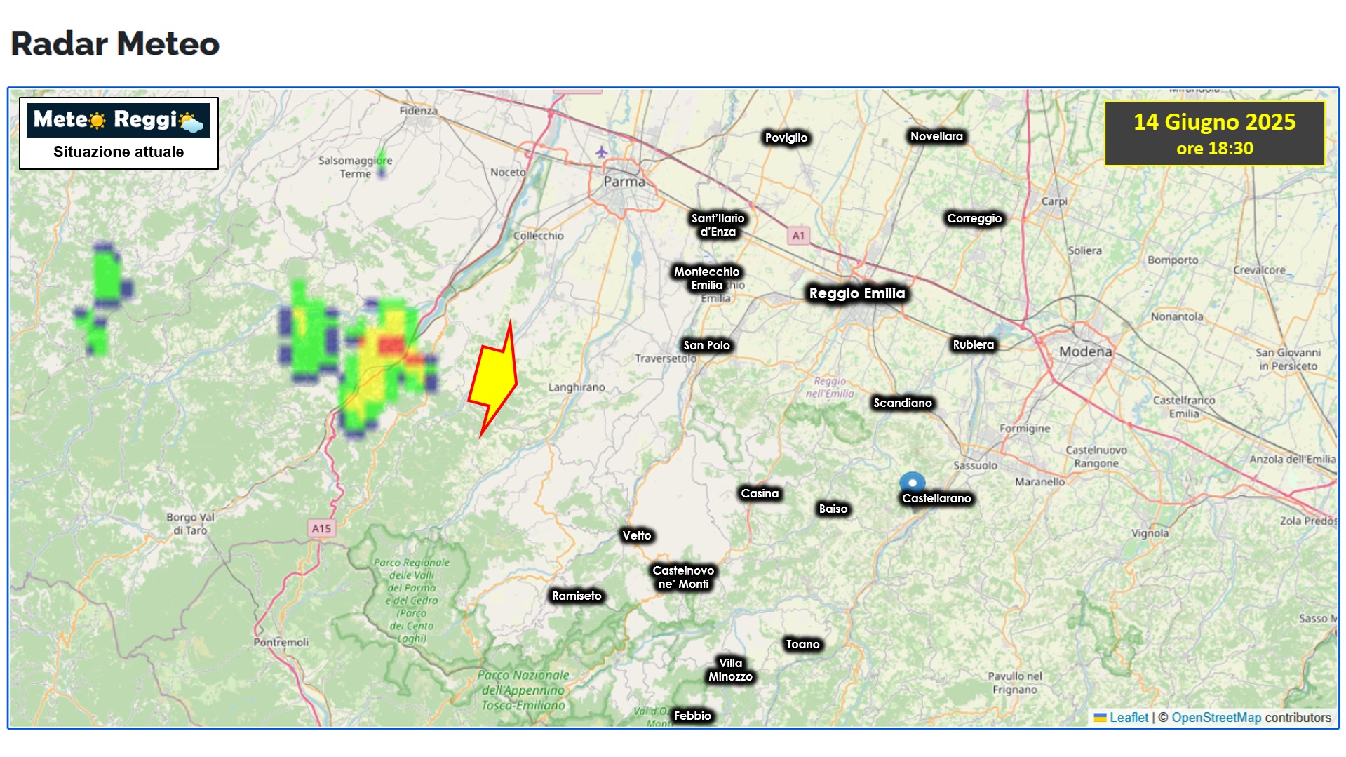 Un temporale è in atto nel parmense già da un'oretta abbondante e da Fornovo di Taro si dirige verso Langhirano. E' presente anche un nucleo grandinigeno con fulminazioni.
