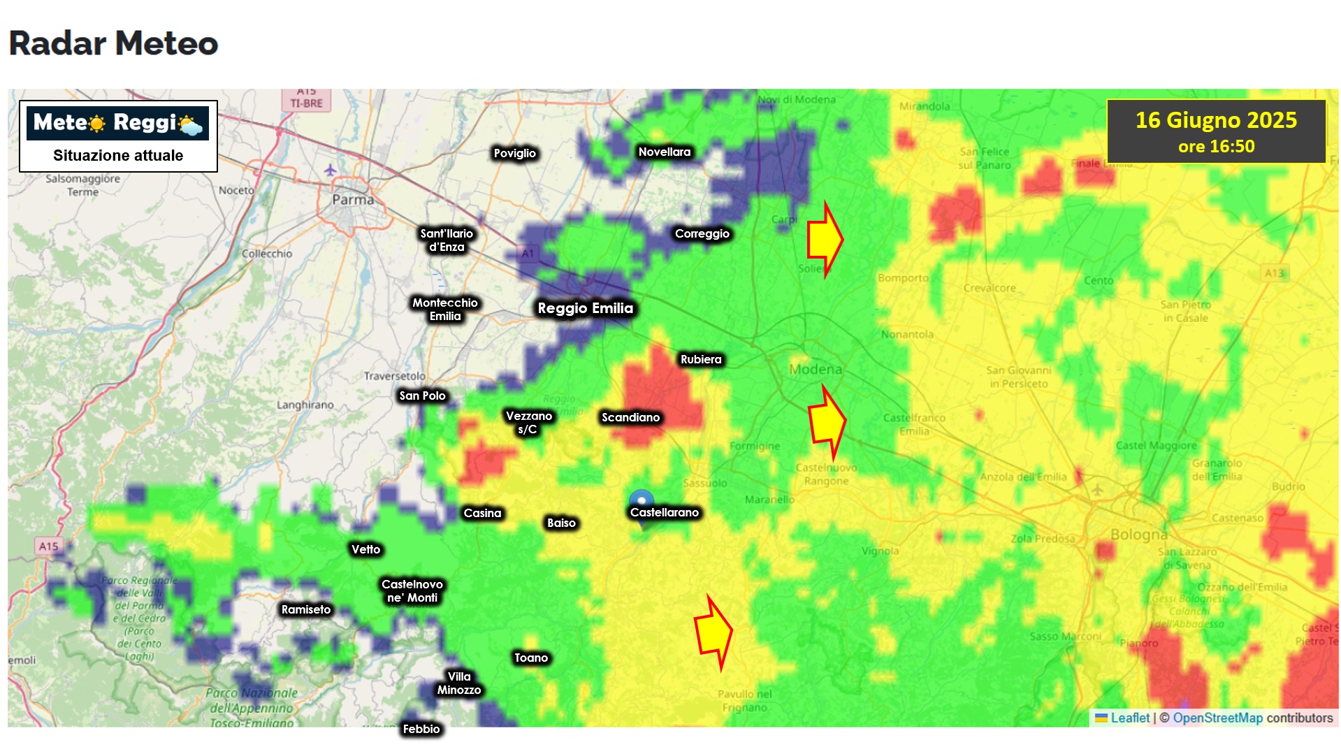 Ora il sistema temporalesco sta abbandonando il reggiano e prosegue il suo percorso verso est, ma con molta meno energia di quanta sprigionata tra Scandiano e Sassuolo.