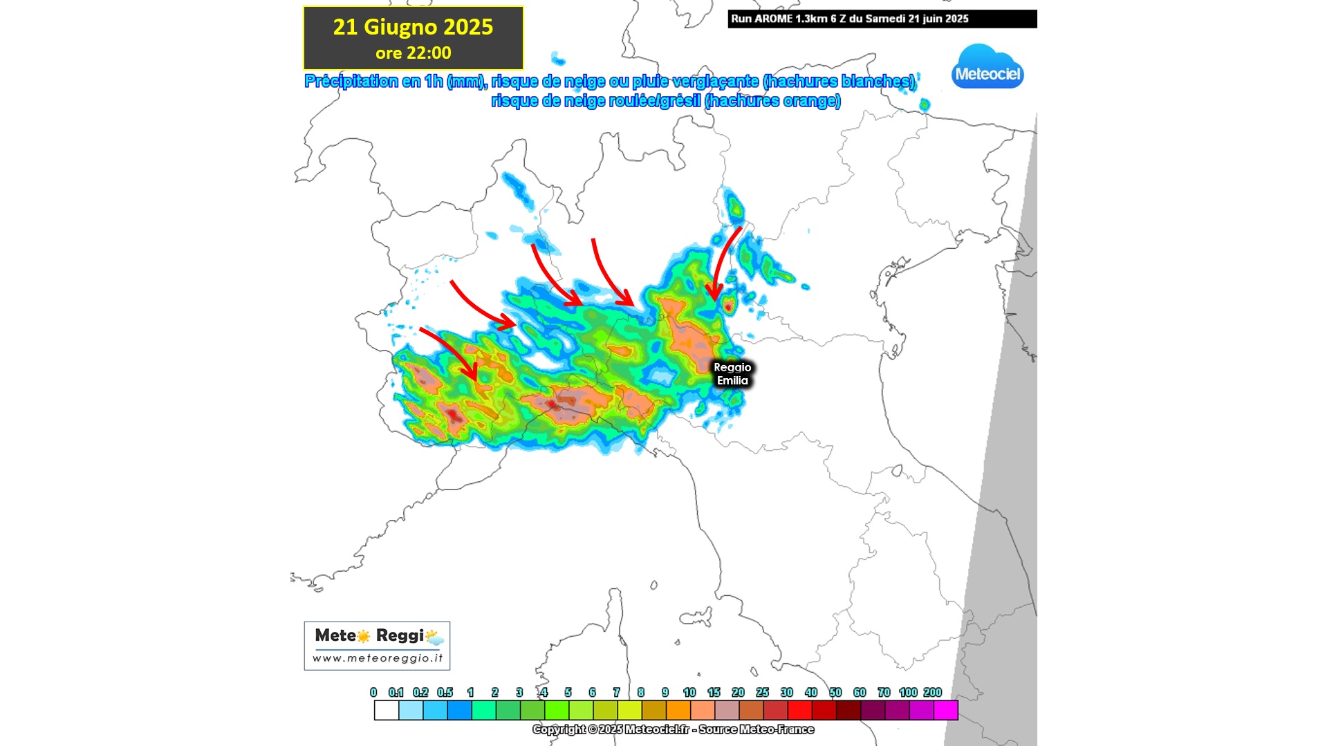 ⚠️ Le ultime elaborazioni modellistiche mostrano un lieve anticipo dell’arrivo della perturbazione attesa dalla Lombardia. Secondo uno dei modelli più affidabili (e coerente con l’evoluzione osservata della giornata), non si esclude l’arrivo di piogge o rovesci su Reggio Emilia poco prima della conclusione del concerto. Non lo diciamo per "certezza", ma per far preparare a questa eventualità il pubblico presente.