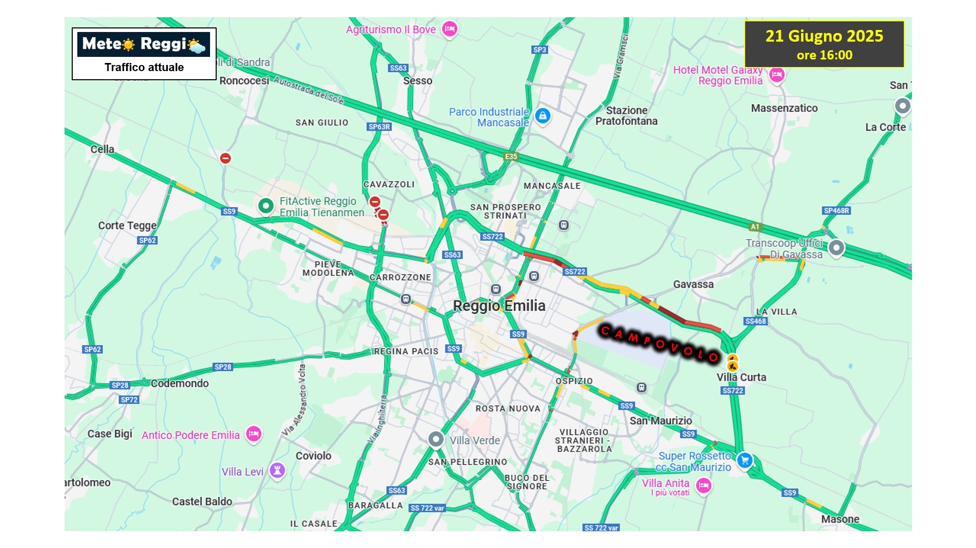 Traffico bloccato in tangenziale attorno all'RCF Arena, mentre in Autostrada tutto scorre. Traffico intenso anche su Via del Chionso, Viale Margherita e a tratti sull'onda verde.