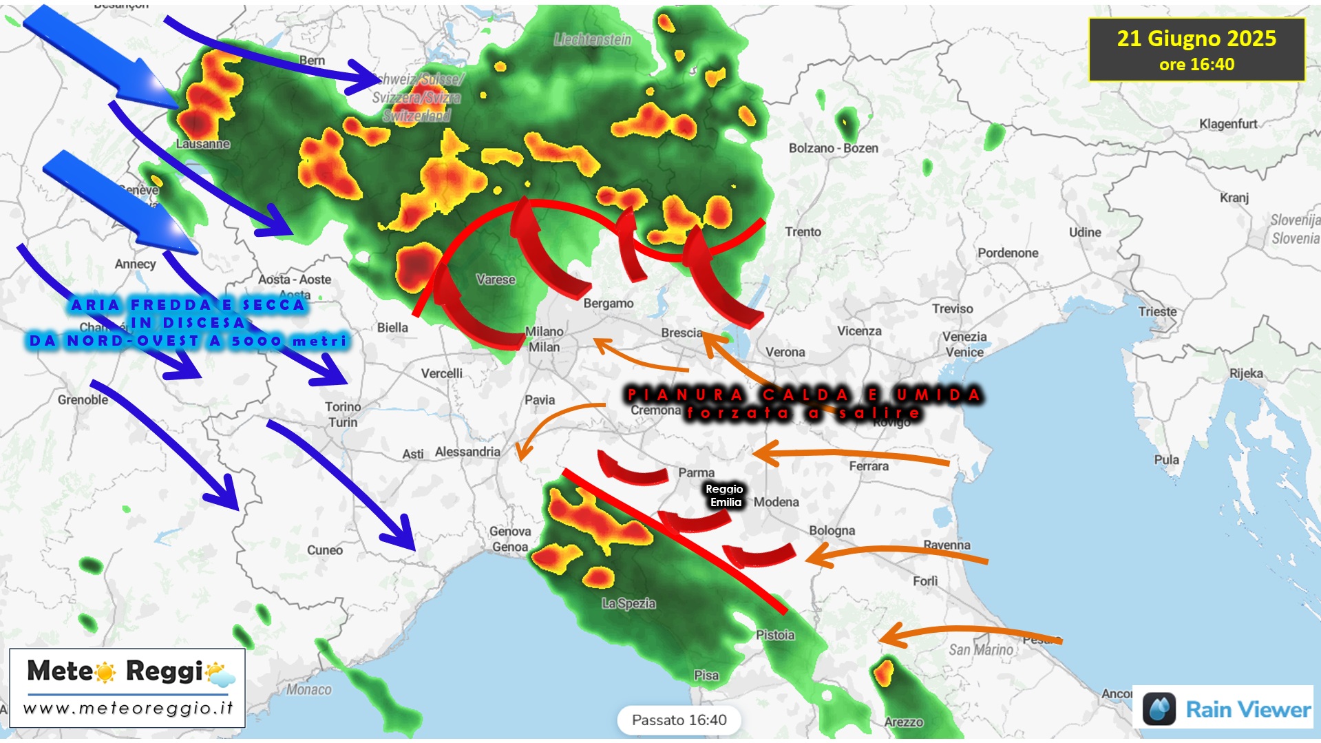 Nel mezzo una calda Pianura che al momento raggiunge i 32°C facendo registrare una flessione di un paio di gradi pieni rispetto a ieri, complice il vento fresco che arriva dall'Adriatico. Guadagno termico, ma l'umidità è chiaramente un po' più alta di ieri.