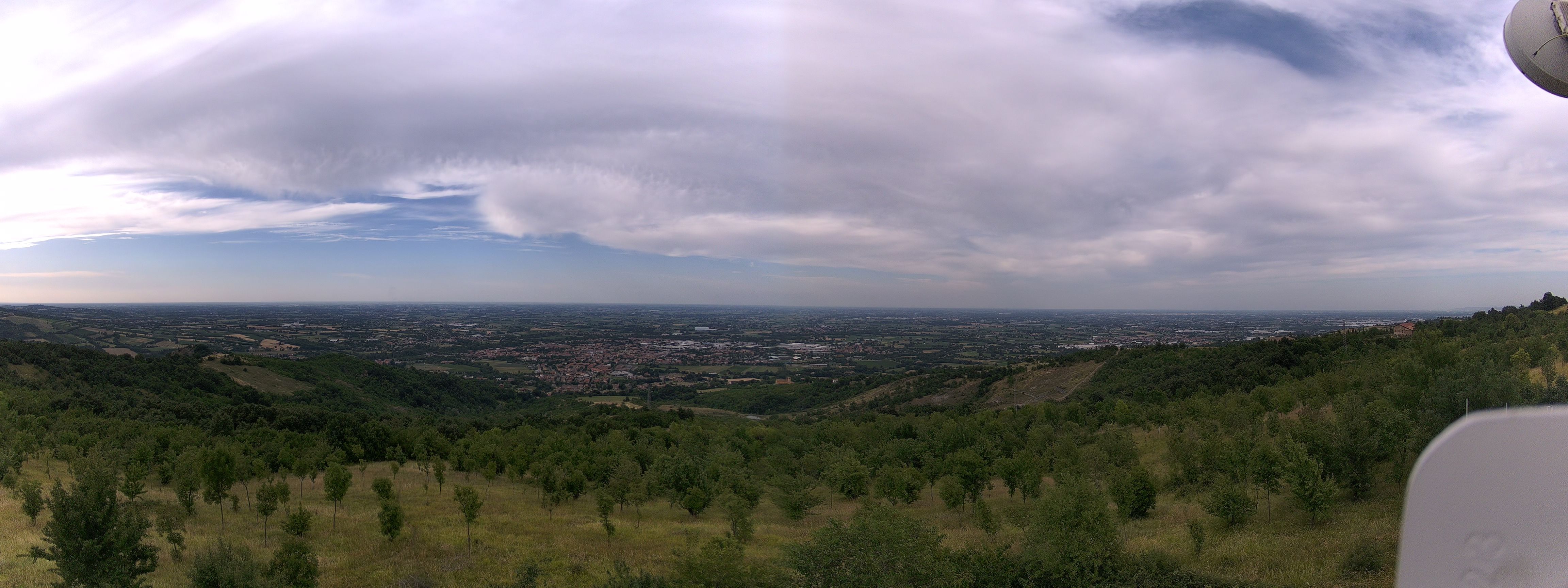 Sono arrivati un po' di Cirrostrati che ora dopo ora hanno steso un velo esteso su gran parte del cielo reggiano. Una coltre che ha fermato la corsa dei termometri che oggi si sono rivelati molto più clementi di ieri. Complici i temporali di ieri, complice l'assenza di una ventilazione di Favonio, complice un po' di vento da nord-est ... insomma ... il tutto si è tradotto in un calo termico nell'ordine di 2°/3°C che accogliamo volentieri, specie se avidi di umidità. L'umidità relattiva, infatti, si aggira attorno al 30%/35% in Pianura con punte inferiori in Città a Reggio Emilia con un 28%.