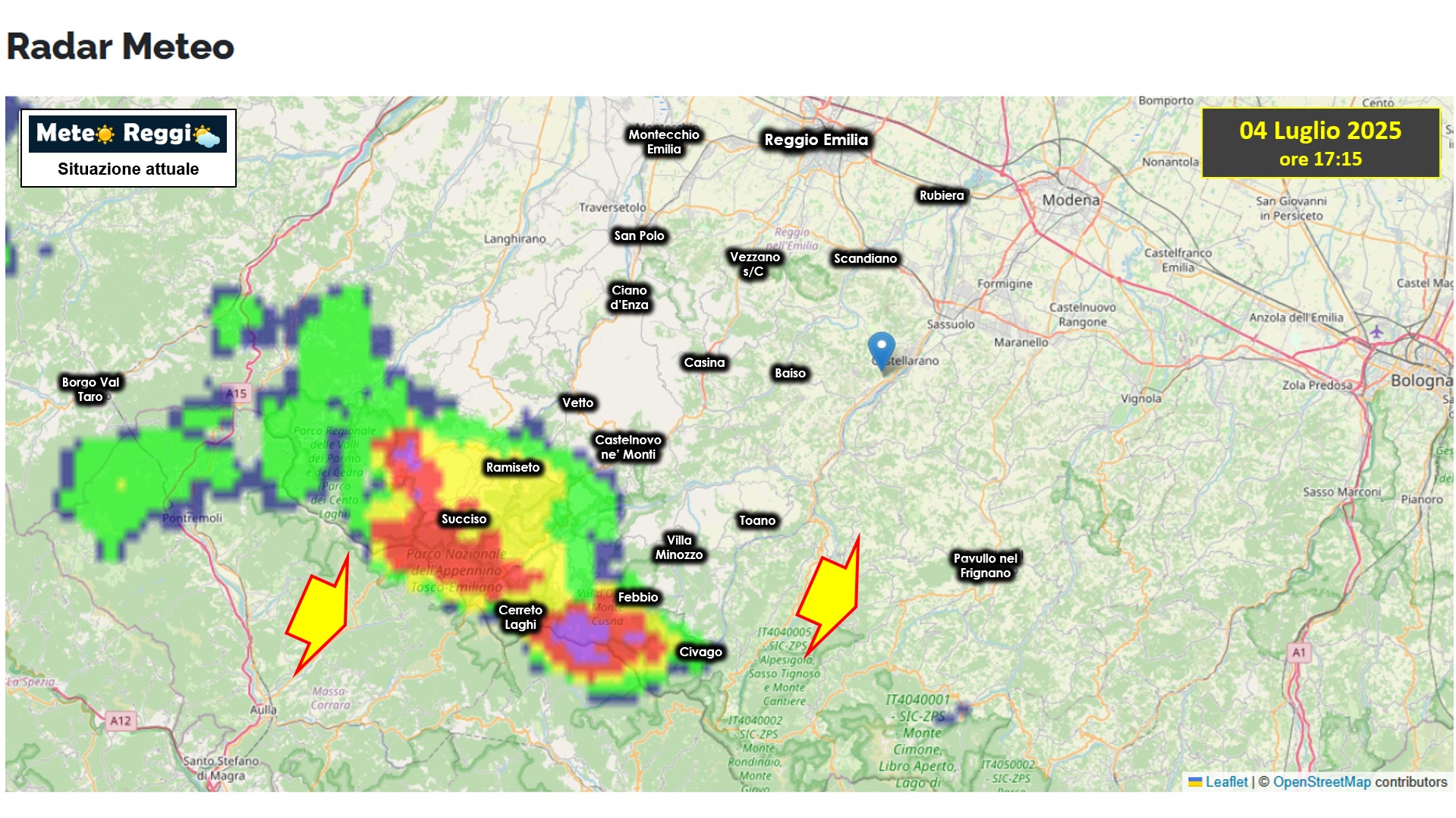 In quest'ultima ora il temporale appenninico ha raggiunto il reggiano. Attualmente abbiamo una linea di piogge che va dal confine parmense fino a quello modenese. Una cella intensa sta interessando la Valle dell'Ozola e l'alta Valle del Dolo con eventi grandinigeni a corredo.