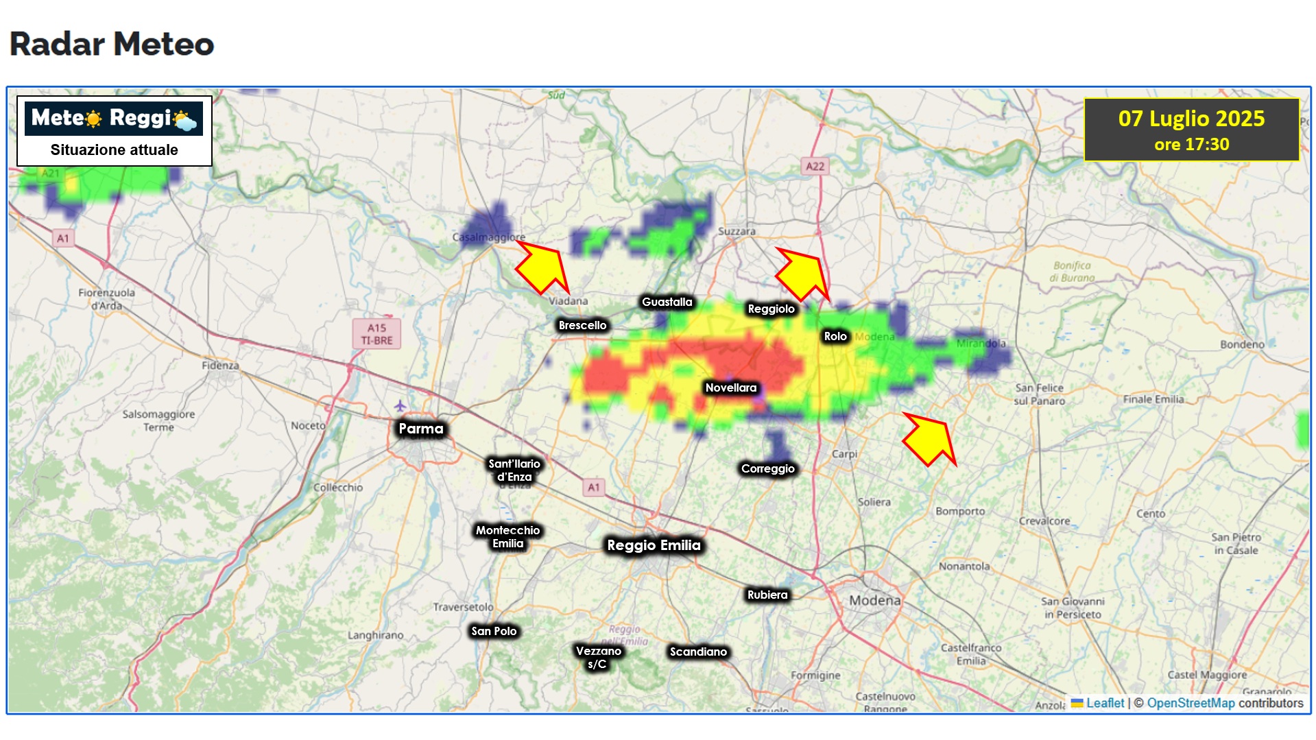 Attualmente abbiamo un nucleo inteso su Novellara, nato da due piccole celle in crescita su Cogruzzo e Brescello. Non si segnala grandine anche se nei prossimi minuti qualche piccolo chicco potrebbe presentarsi tra Fabbrico e Rolo. Il sistema è in lento spostamento verso nord-est.