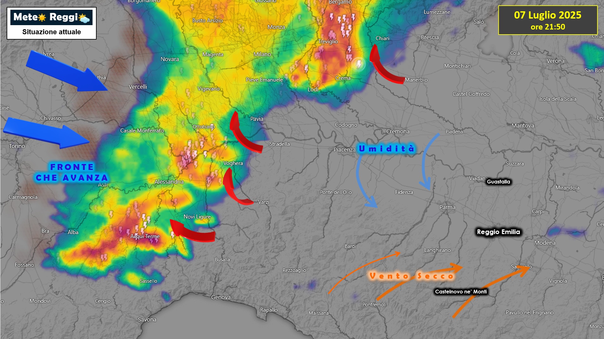 Un gioco di correnti contrapposte che ha portato alla formazione di una vastissima linea temporalesca che attraversa tutto il nord-Italia longitudinalmente. Un fronte che sta portando diversi danni su Piemonte e Lombardia e che nelle prossime ore transiterà anche nel reggiano con l'auspicio che lo faccia in modo più "moderato".