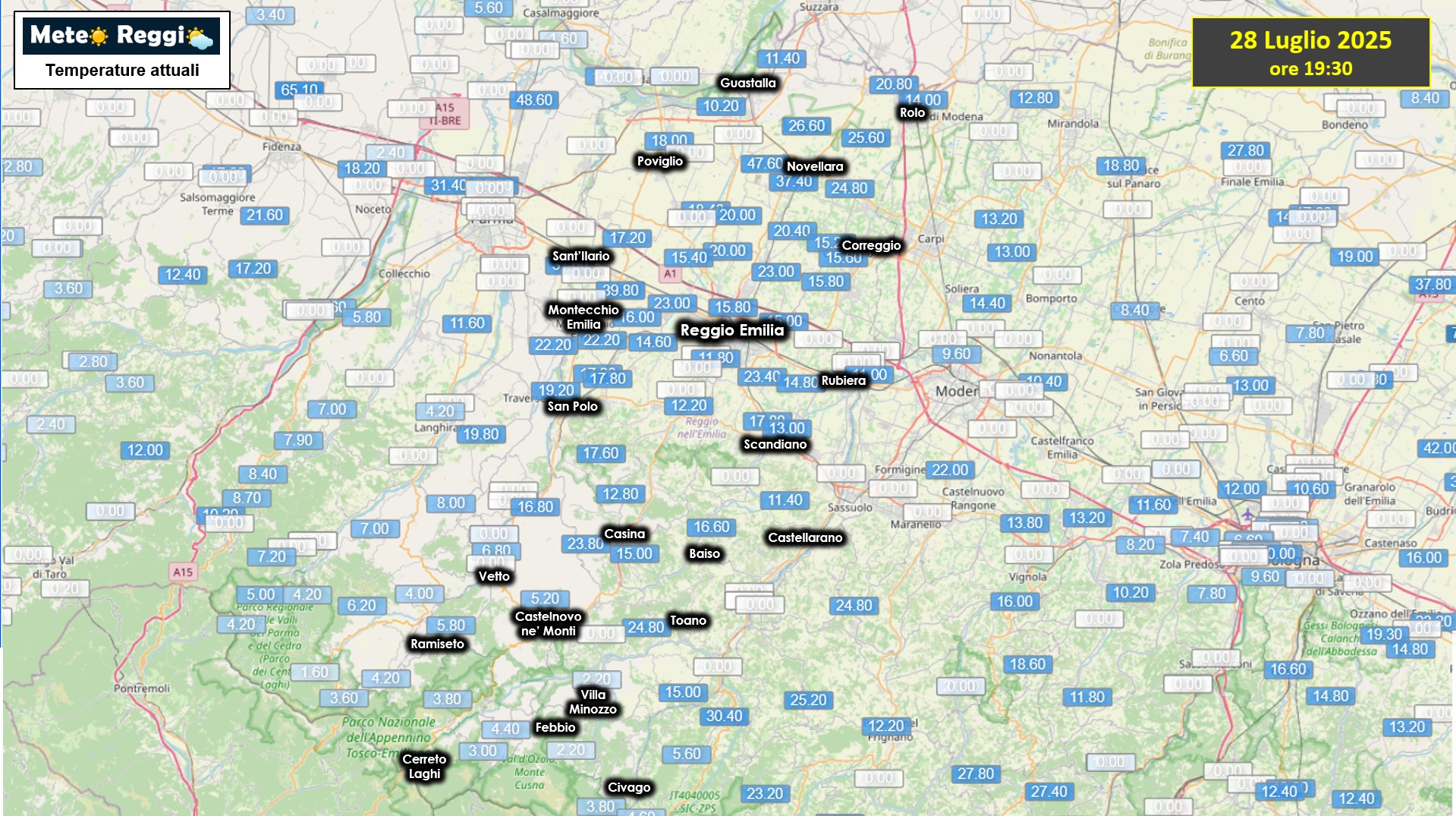 Bollettino meteo delle 19:45 Prime schiarite verso ovest, ma il cielo resta plumbeo sotto un tappeto compatto di nuvole grige d'alta quota. Per tutta la giornata abbiamo avuto piogge non irresistibili e d'intensità costante o moderata. Tuttavia abbiamo delle stazioni che hanno superato i 30 mm con una punta di 47,6 mm a Santa Vittoria. Frutto dei temporali della notte e degli acquazzoni del primo mattino. Temperature massime che hanno raggiunto 23,7°C a Reggio nell'Emilia, mentre in montagna sono Febbio e Ospitaletto ad aver fatto registrare le massime più basse: 16,3°C a Febbio 16,2°C a Ospitaletto Ecco gli accumuli di pioggia di oggi: 47.6 mm a Santa Vittoria 39.8 mm a Montecchio Emilia 37.4 mm a Santa Maria della Fossa 26.6 mm a Novellara 25.6 mm a Fabbrico 24.8 mm a Rio Saliceto 24.8 mm a Ponte Cavola 23.8 mm a Predolo 23.4 mm a Bosco di Scandiano 23 mm a Codemondo 23 mm a Massenzatico 22.2 mm a Bibbiano 20.8 mm a Reggiolo 20.4 mm a Bagnolo in Piano 20 mm a Sesso 20 mm a Villa Argine 18.4 mm a Cadelbosco 18 mm a Poviglio 17.8 mm a Quattro Castella 17.8 mm a Ca' de Caroli 17.6 mm a Canossa 17.2 mm a Sant'Ilario d'Enza 17.2 mm a Quattro Castella 16.8 mm a Roncovetro 16.6 mm a Baiso 16 mm a Cavriago 15.8 mm a Prato di Correggio 15.8 mm a Reggio nell'Emilia urbana 15.6 mm a Correggio 15.4 mm a Roncocesi 15.2 mm a San Martino in Rio 15 mm a Carpineti 15 mm a RCF Arena - San Maurizio 14.8 mm a Arceto 14.6 mm a San Bartolomeo 14 mm a Rolo 13 mm a Scandiano 12.8 mm a La Stella 12.2 mm a Broletto di Albinea 11.8 mm a Canali 11.4 mm a Guastalla 11.4 mm a S. Valentino 10.8 mm a Boretto 10.2 mm a Gualtieri 7.6 mm a Vetto 6.8 mm a Vetto Pluvio 5.8 mm a Ramiseto 5.2 mm a Castelnovo ne' Monti 4.4 mm a Ligonchio 4.2 mm a Succiso 3.8 mm a Civago 3.8 mm a Collagna 3 mm a Ospitaletto 2.2 mm a Febbio 2.2 mm a Villa Minozzo