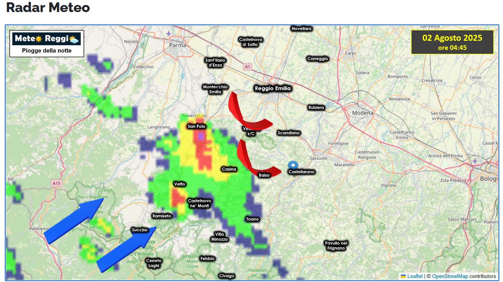 Nella notte i temporali hanno interessato la valle dell'Enza, ma avanzando verso nord-est hanno poi perso progressivamente forza fino ad estinguersi poco prima di raggiungere la Via Emilia ed il comprensorio ceramico.