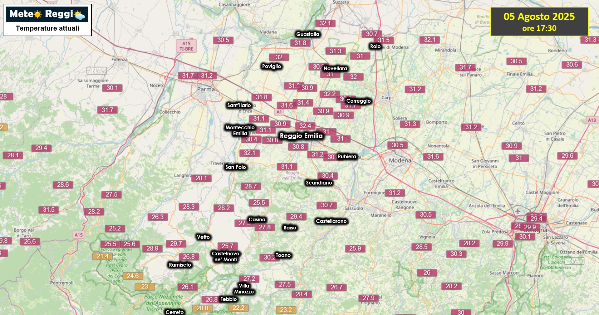 Torna un po' di caldino su tutto il nostro territorio. Il Sole non ha trovato ostacoli in cielo a parte la solita nuvolaglia che si presenta ciclicamente sul nostro Crinale. Questo ha permesso ai termometri di salire oltre i 32°C in diverse strazioni tra il Po e la Via Emilia.