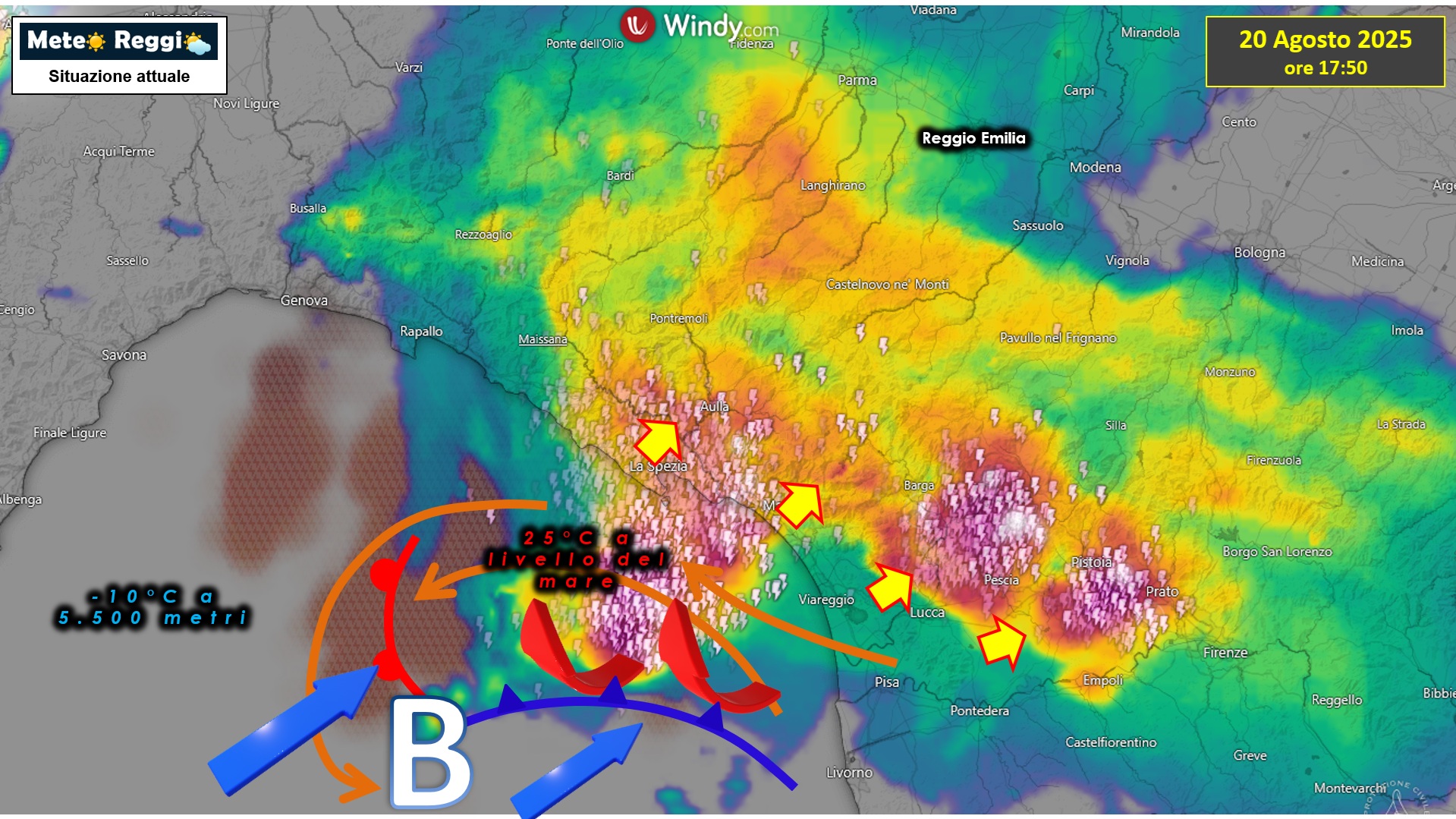 Piove già sulla Pedecollinare mentre al largo delle coste di Liguria-Toscana è sempre più evidente la forma a "V" della cella autorigenerativa che convoglia umidità e pioggia verso di noi.