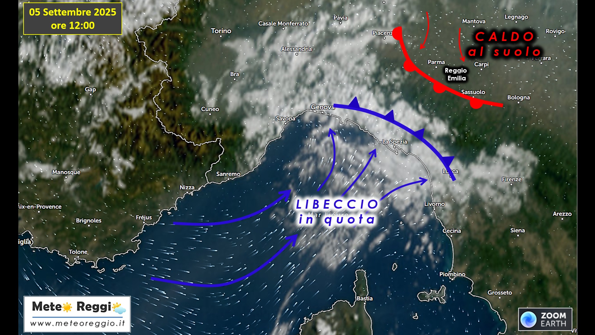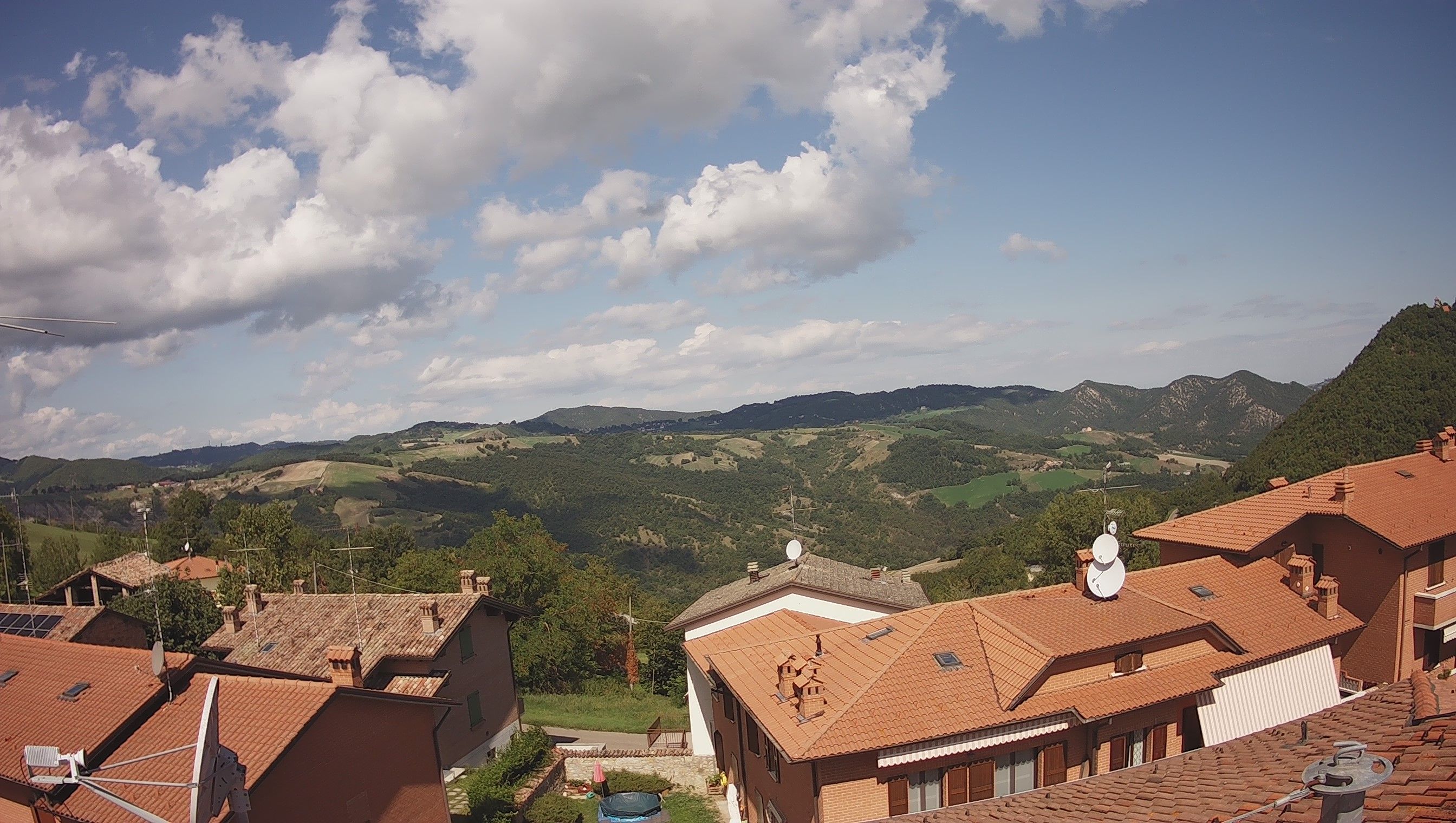 L'aria instabile in arrivo dal mar Ligure bussa contro il nostro Crinale che ne ferma le velleità. Tuttavia abbiamo l'ingresso di qualche "spiffero" dai fianchi del nostro Gigante. Il più permeabile appennino parmense permette l'arrivo delle prime nuvole cumuliformi sulla nostrao collina ad iniziare dal fianco orientale lungo l'asse dell'Enza.