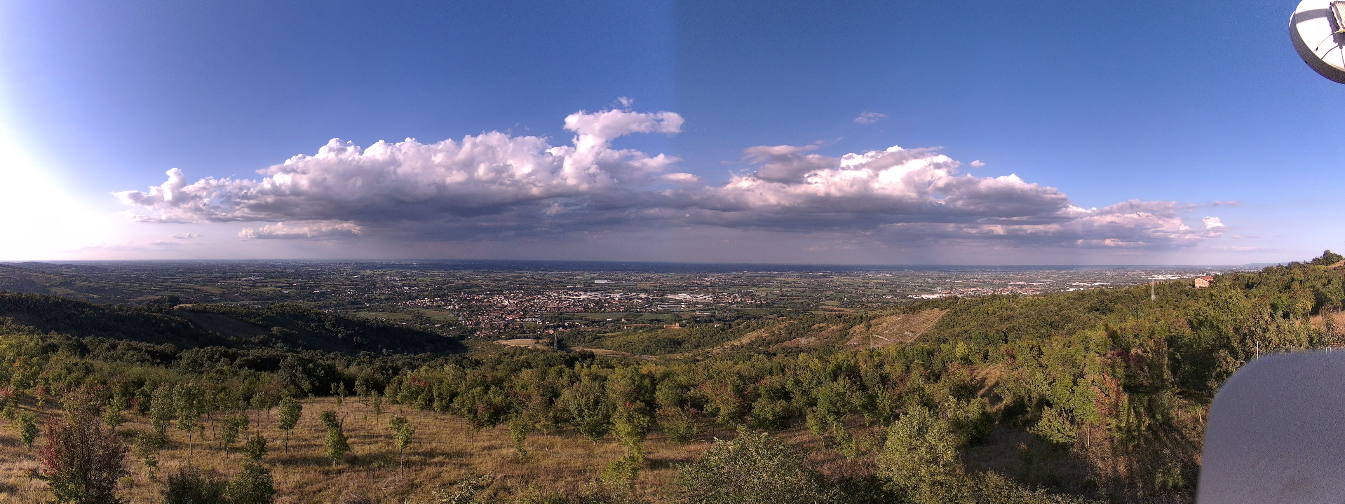 In quota abbiamo aria più fresca e secca e in queste ore si è formata una lunga fascia di nuvole cumuliformi che si estende lungo la Via Emilia che da Reggio Emilia arriva a Bologna.